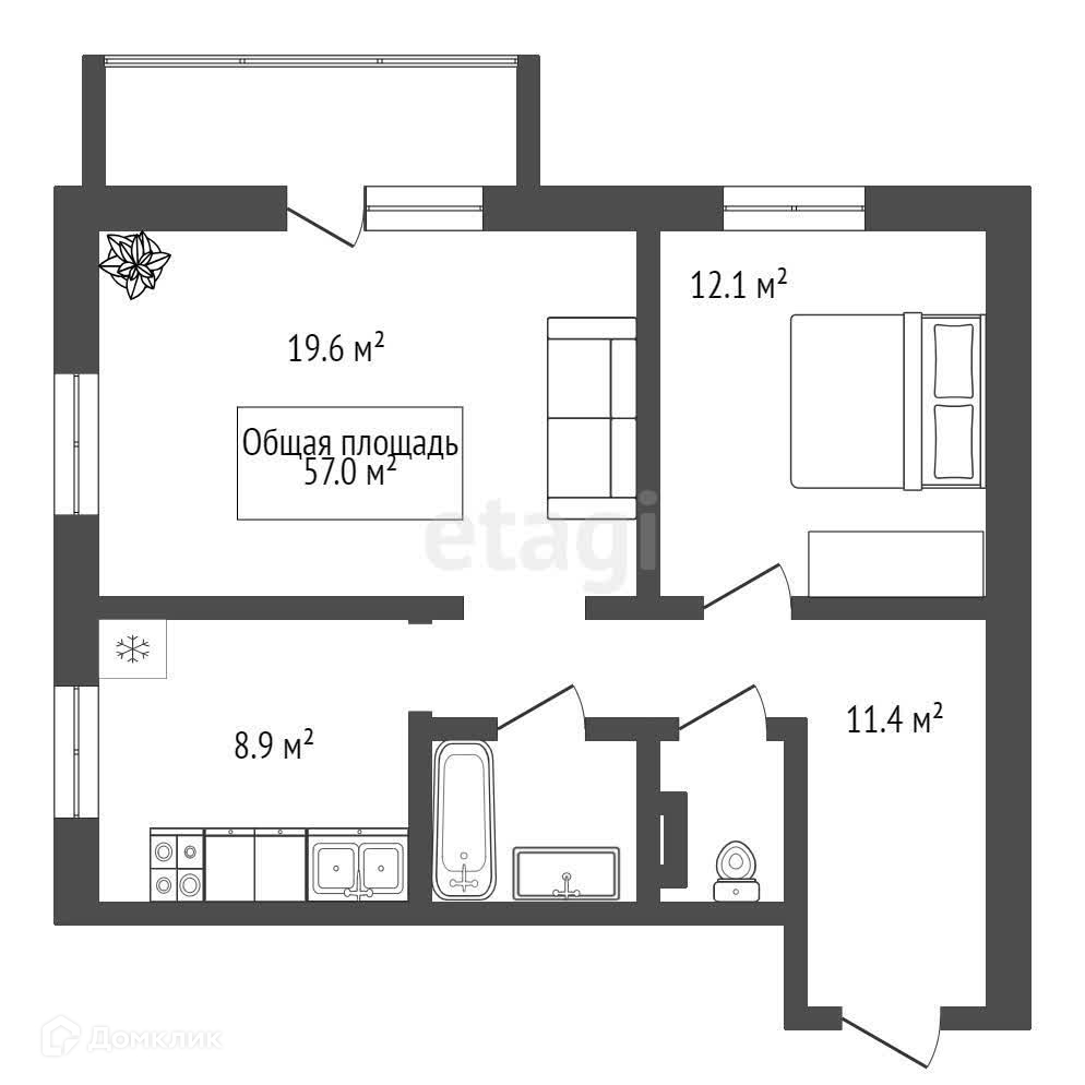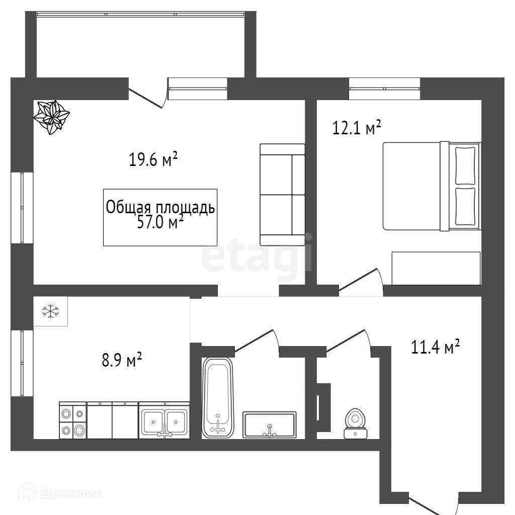 Общая площадь 57.5 м2