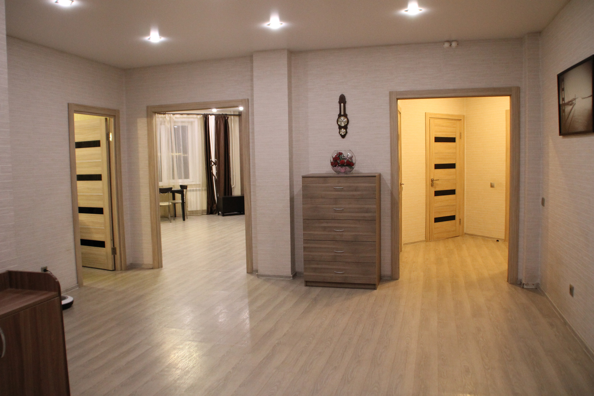Кухня-столовая 27м2, просторные изолированные комнаты, большой холл, два санузла. В квартире очень тепло, все батареи снабжены системой регулировки, также квартиру легко проветривать, окна выходят на разные стороны дома. В квартире сделана дополнительная шумоизоляция, имеется система пожарной сигнализации.
