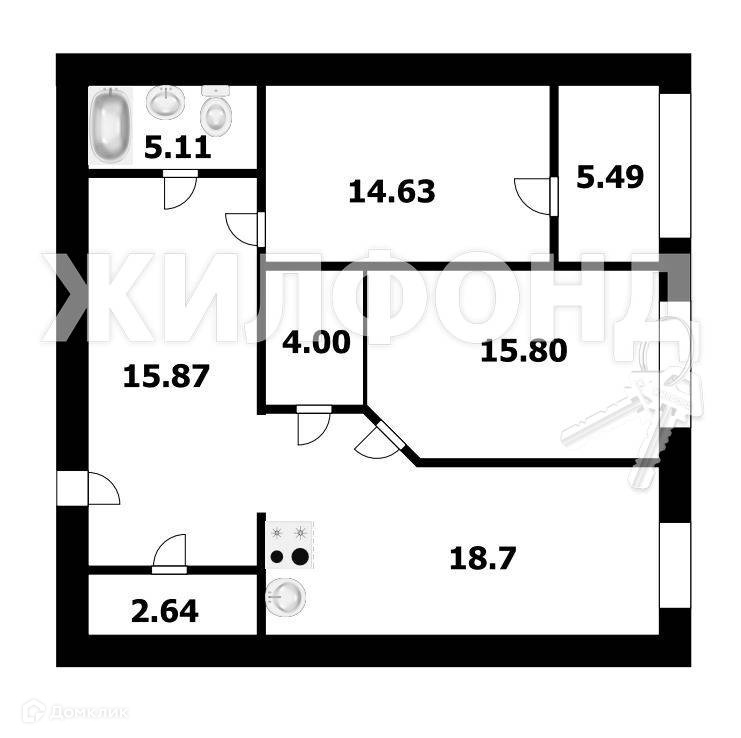 Просторная кухня-гостиная 18.7 кв.м., две спальни 15.8 и 14.6 кв.м., два санузла 5.1 и 2.64 кв.м., большая застекленная лоджия 5.5 кв.м. Высота потолков 3 метра.
