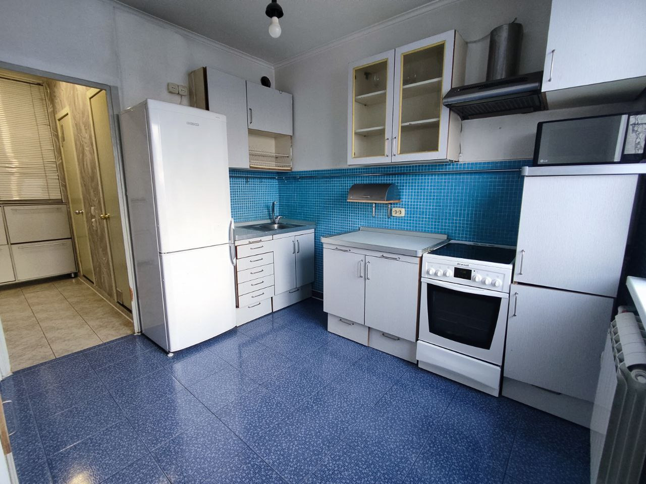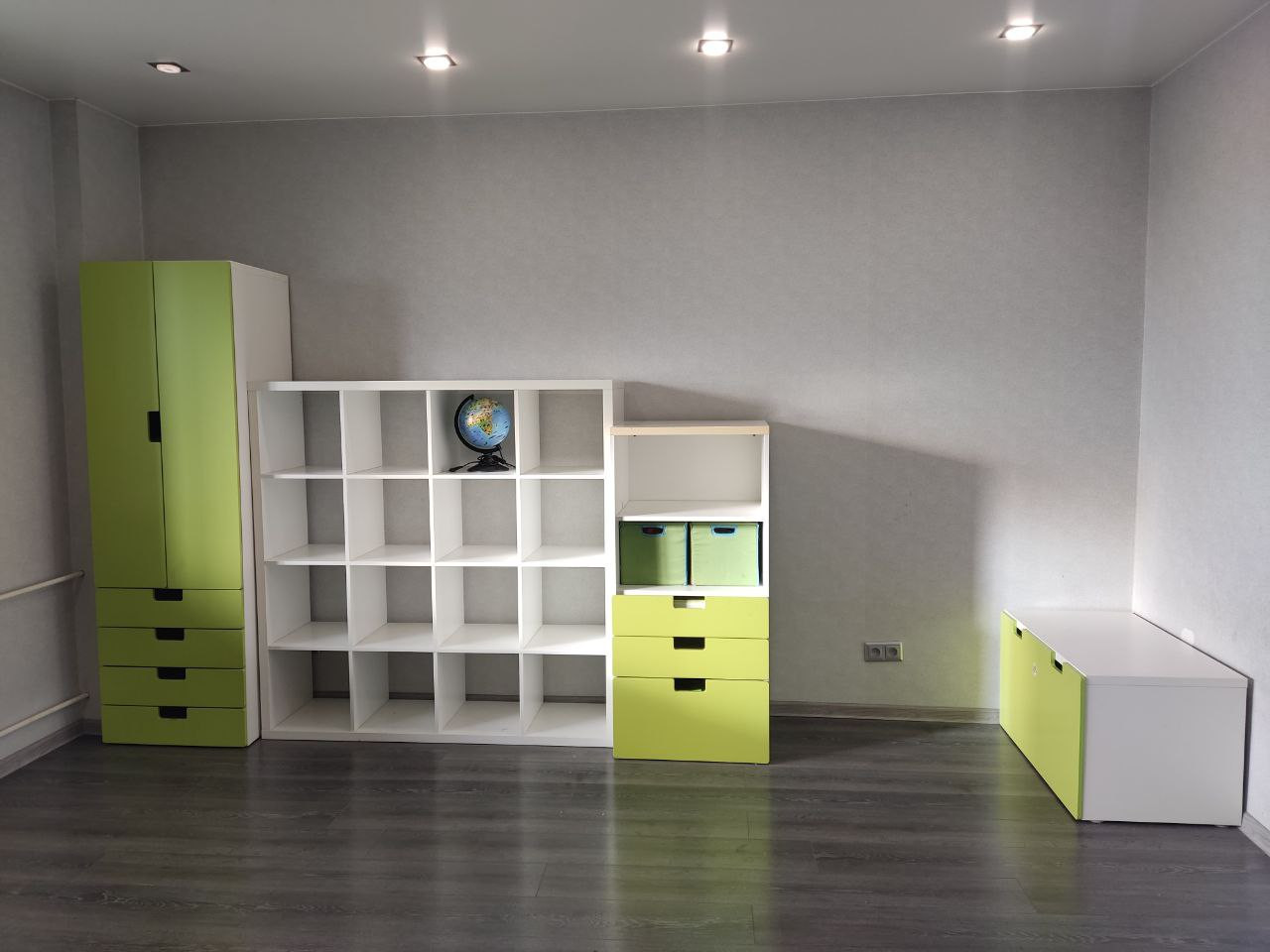 На кухне остается все, что на фото. В зале остаются два шкафа с зелеными фасадами.