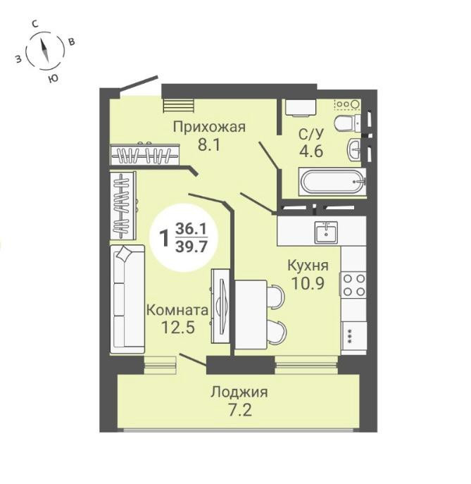 Общая площадь 39.7 м2