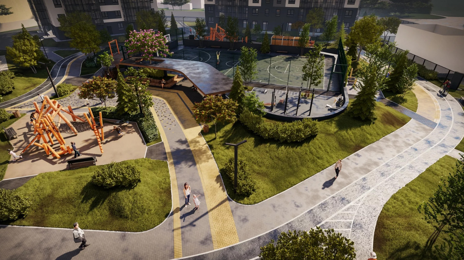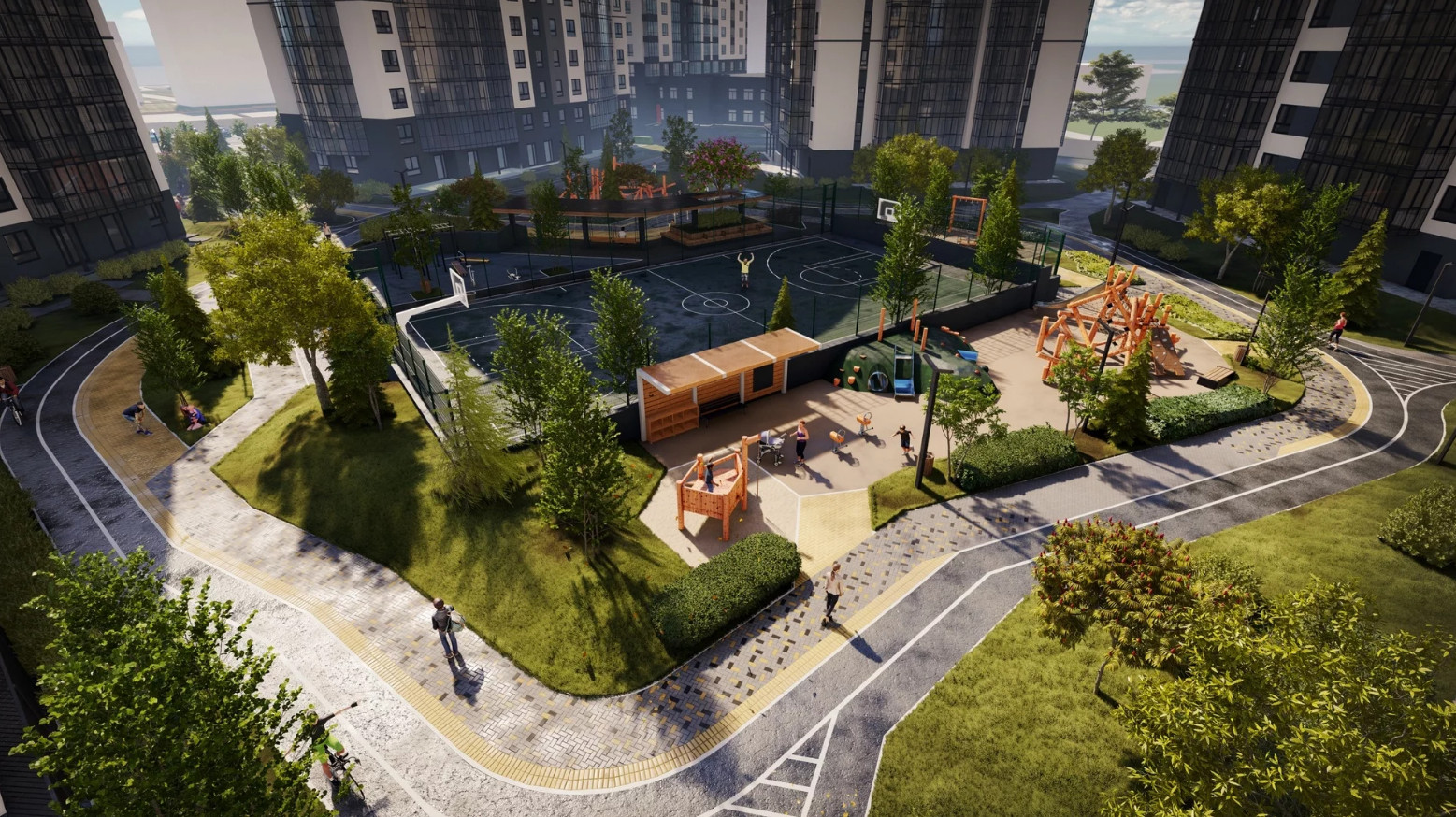 -Закрытый двор-парк с прогулочными дорожками, местами для отдыха и занятия спортом. Хоккейная коробка, детские игровые площадки.