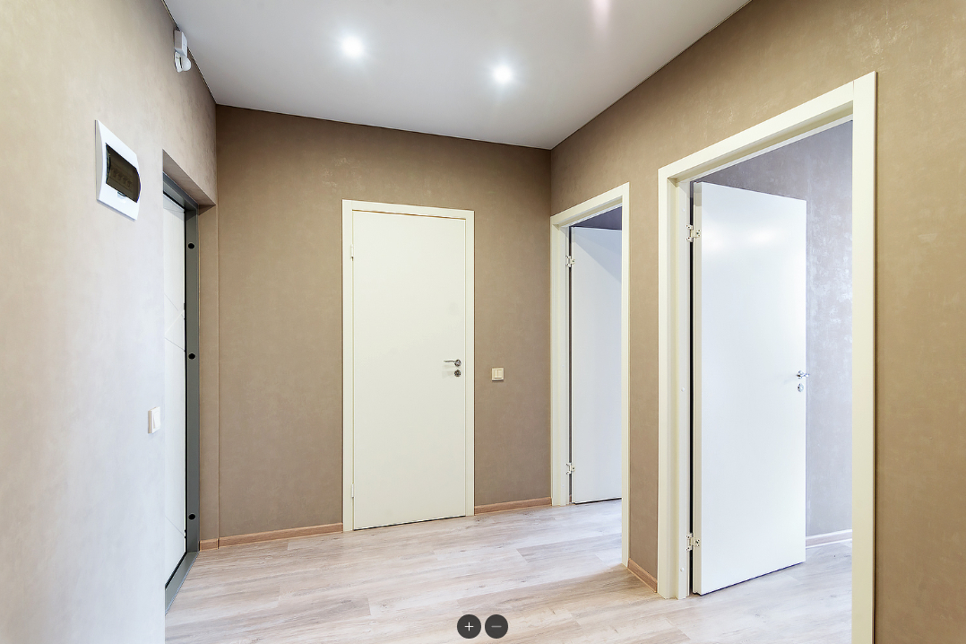 В комнатах и кухне - натяжной потолок, ламинат, обои, установлены двери. Санузлы отделаны кафелем в полную высоту стен, смонтирована сантехника и смесители, точечные светильники. Панорамное остекление балкона в пол, большое количество света.