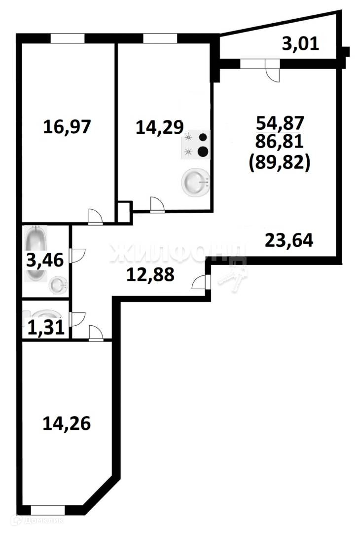 Жилая площадь 54.87 м2