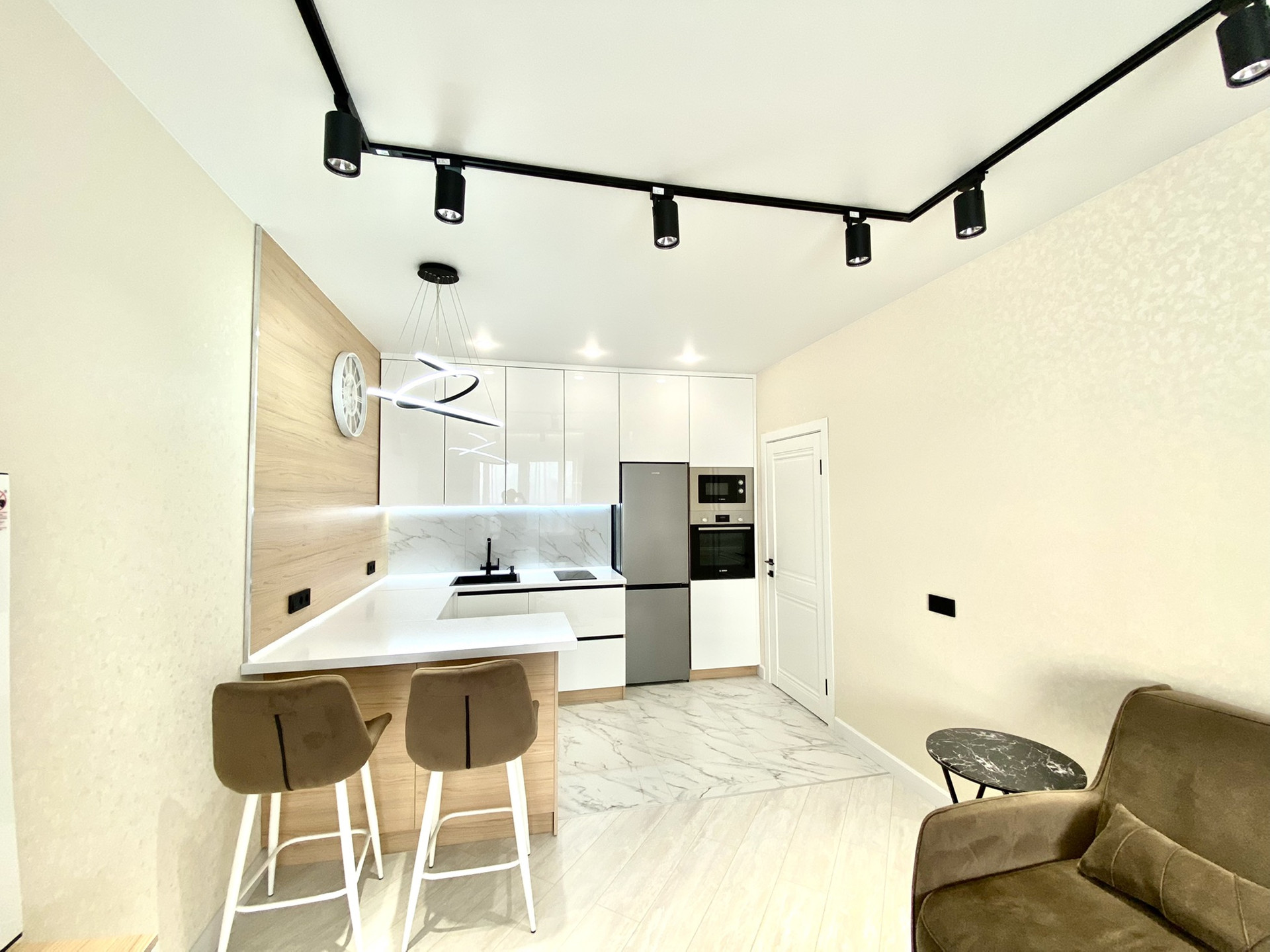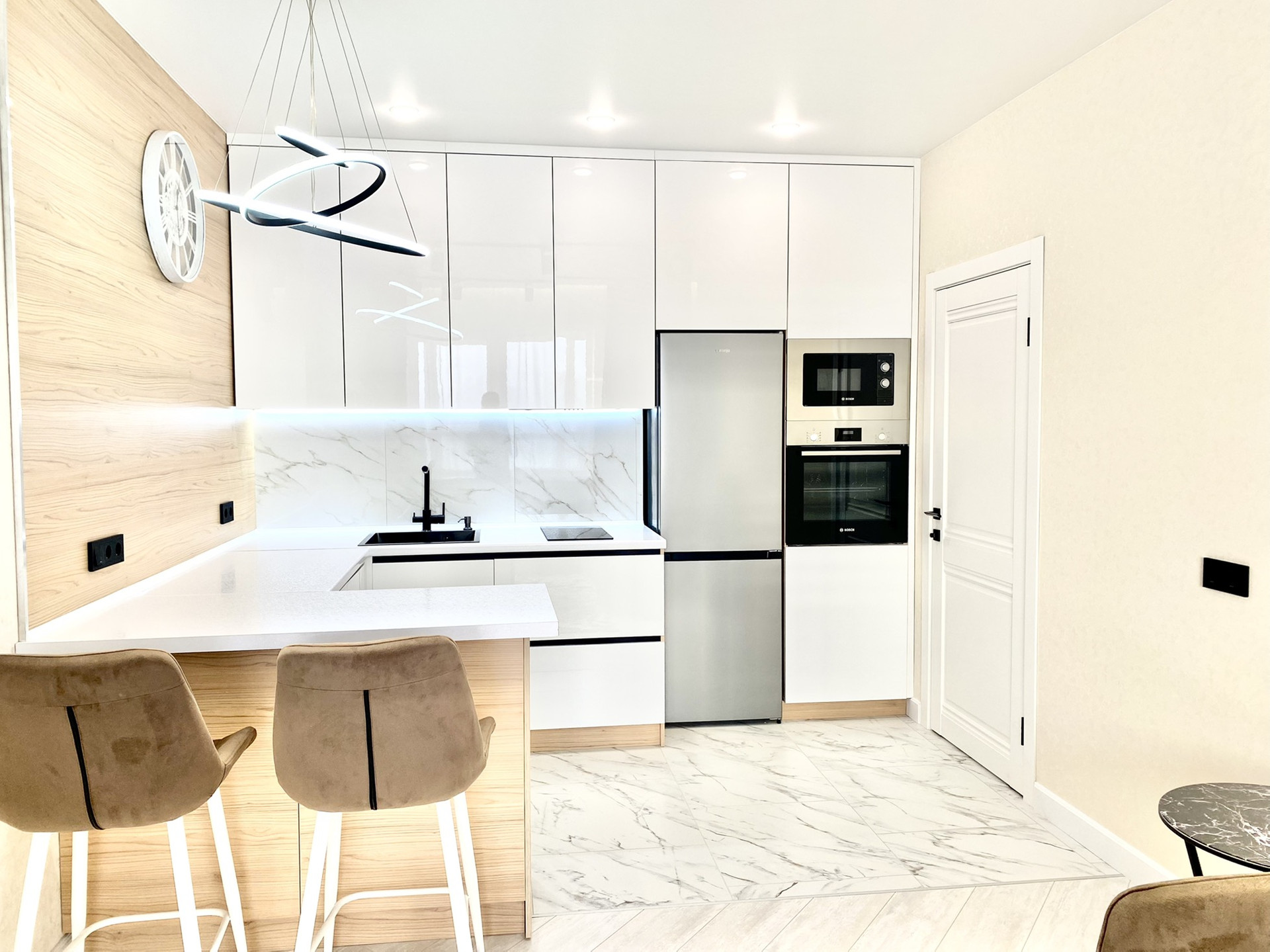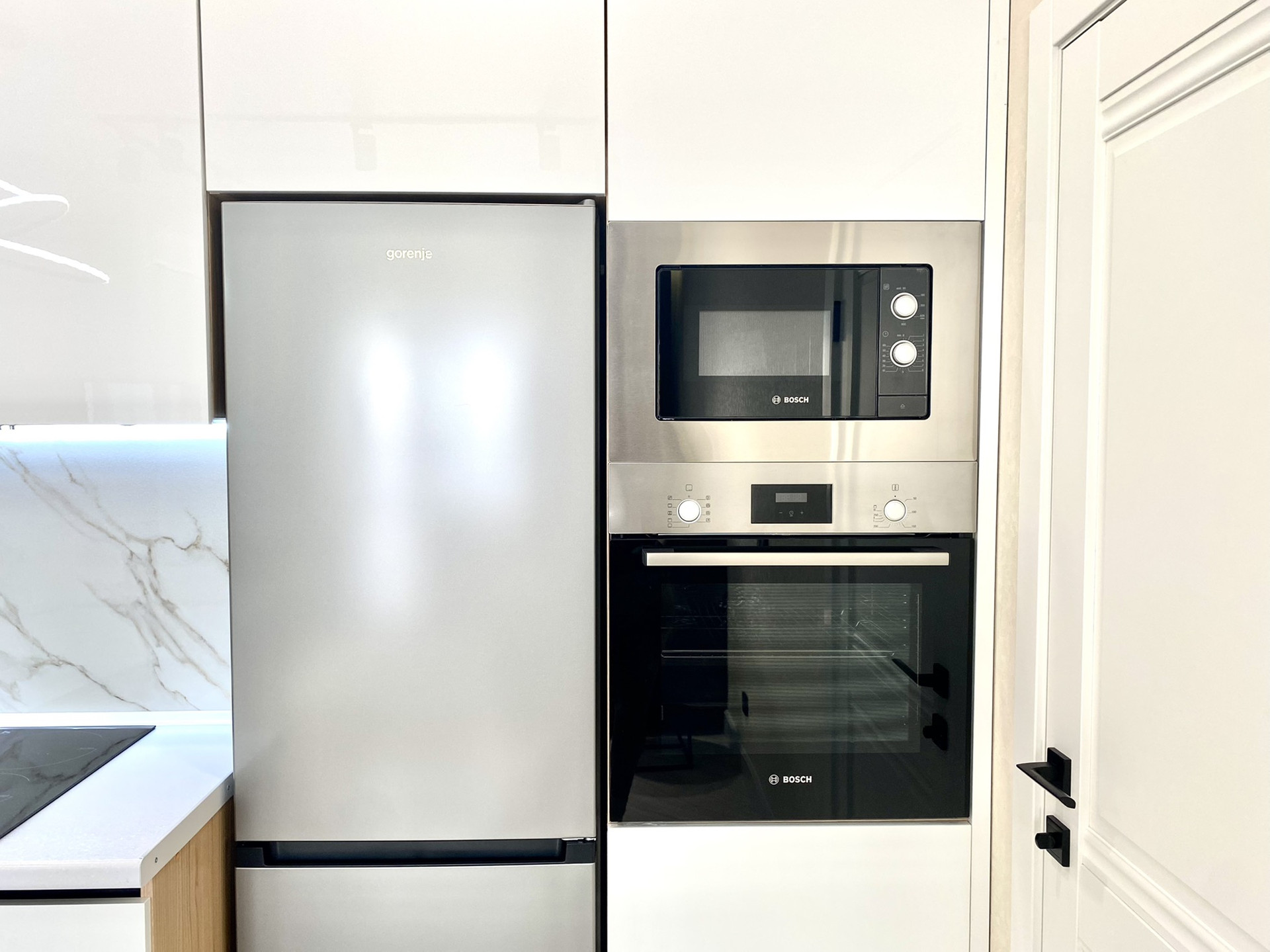 ✔ В гостиной -кухне установлен совеременный гарнитур со встроенной техникой Bosh , варочная поверхность, вытяжка, духовой шкаф , микроволновая печь, посудомоечная машина Hansa, холодильник Gorenje - сделают приятным пребывание на кухне, обеденная стол и 2 мягких стула.