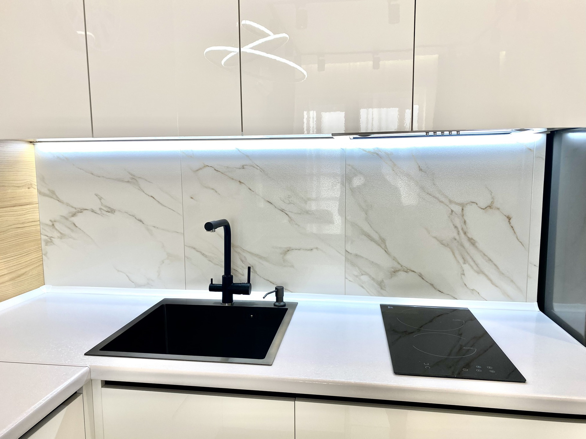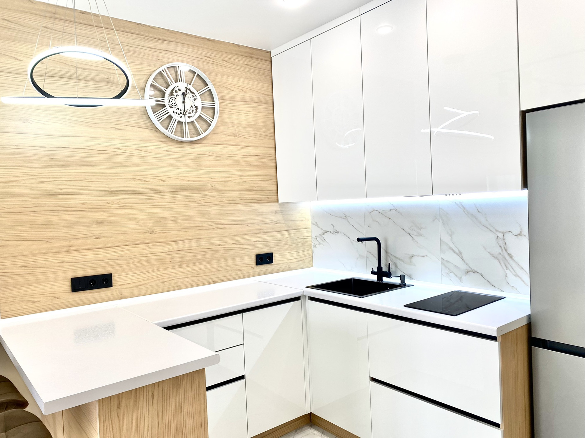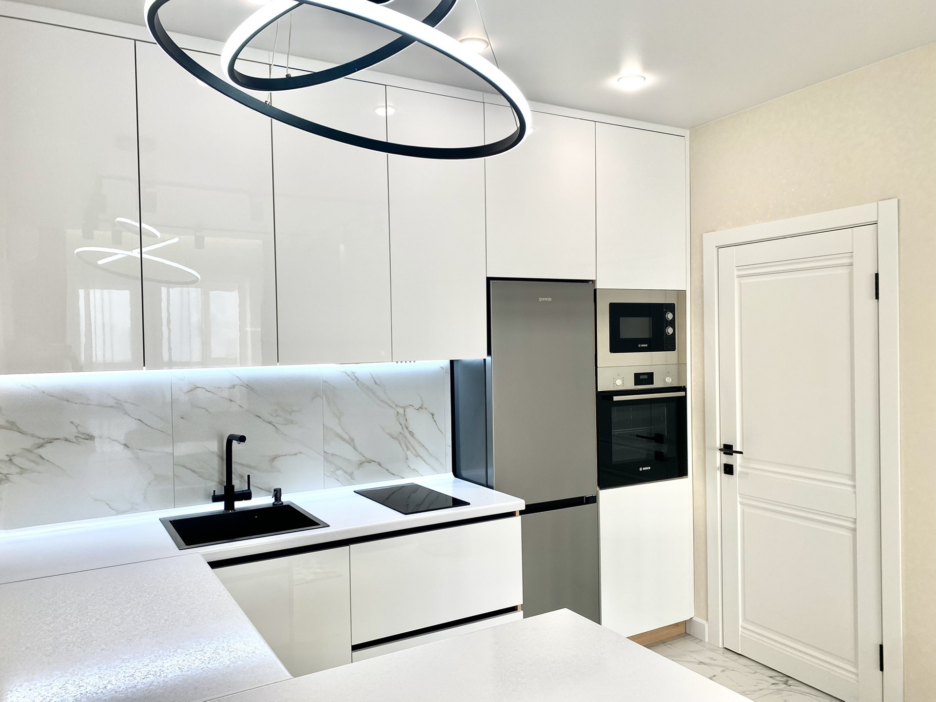 ✔ В гостиной -кухне установлен совеременный гарнитур со встроенной техникой Bosh , варочная поверхность, вытяжка, духовой шкаф , микроволновая печь, посудомоечная машина Hansa, холодильник Gorenje - сделают приятным пребывание на кухне, обеденная стол и 2 мягких стула.