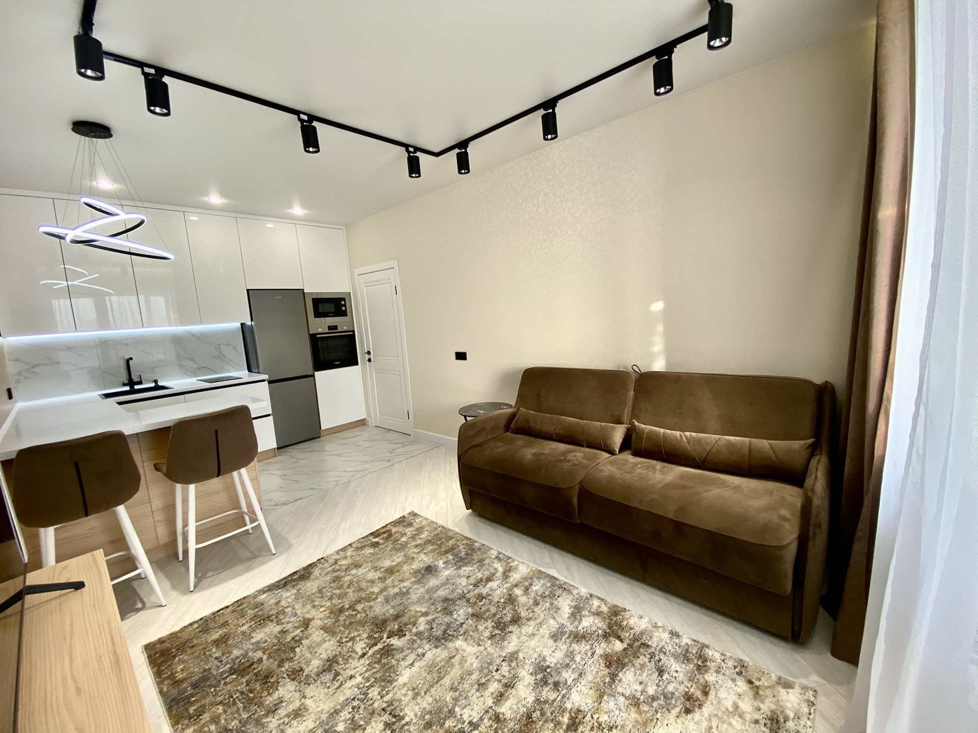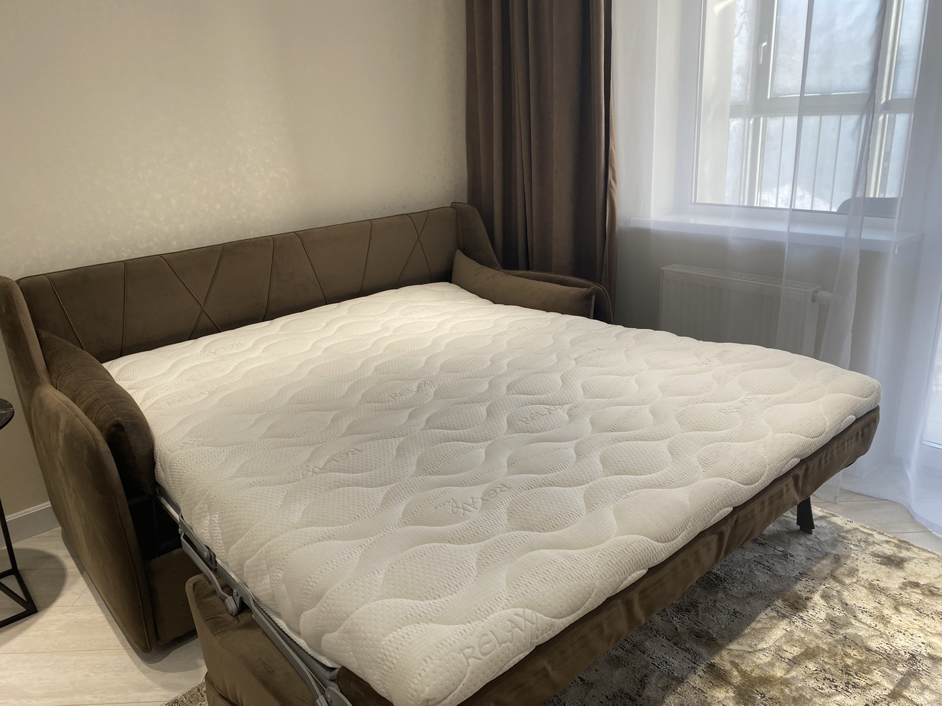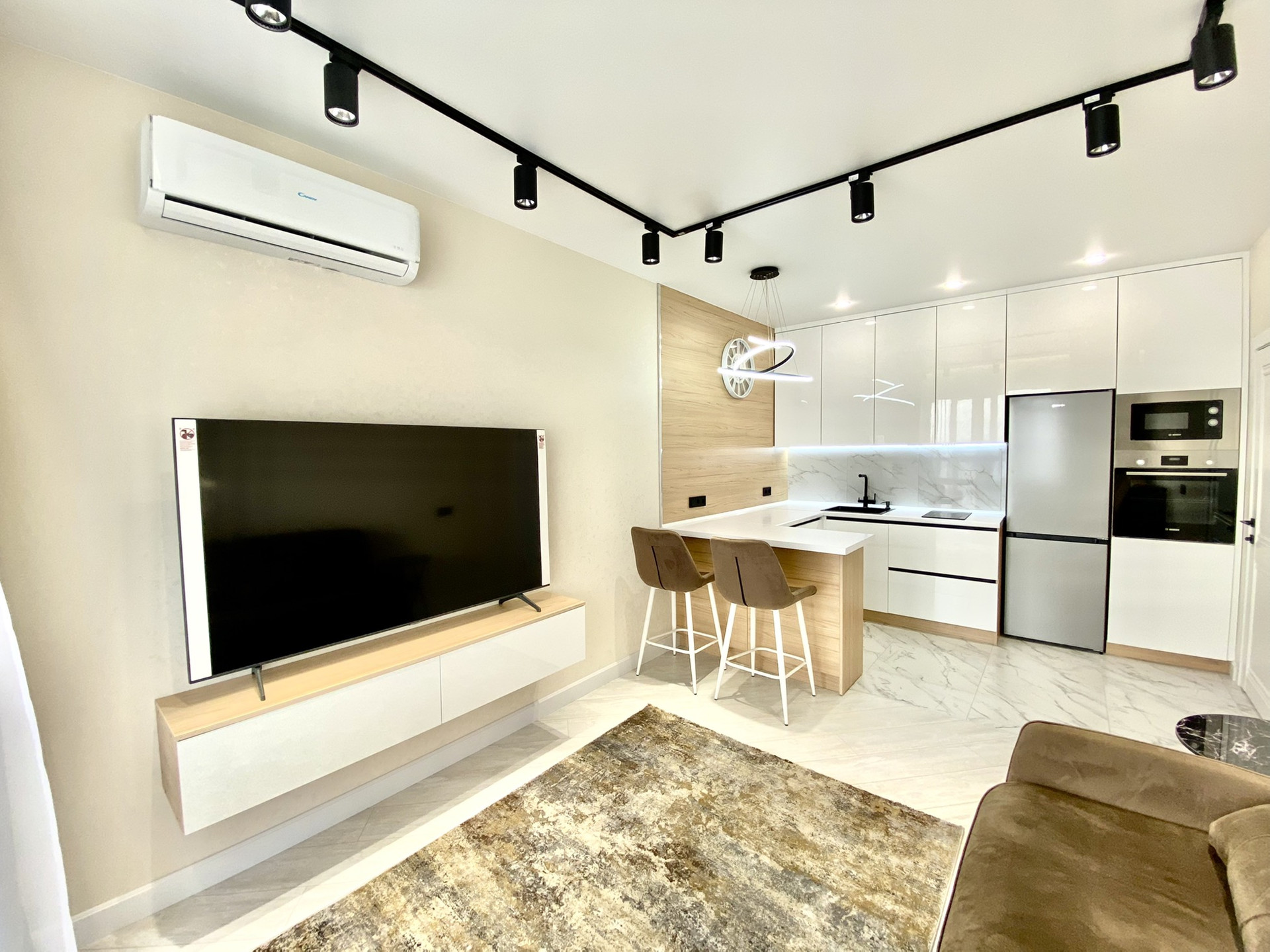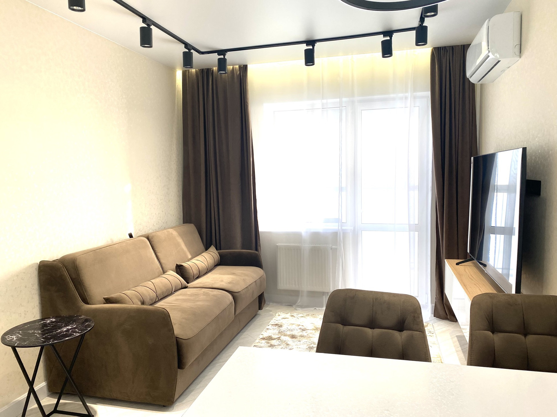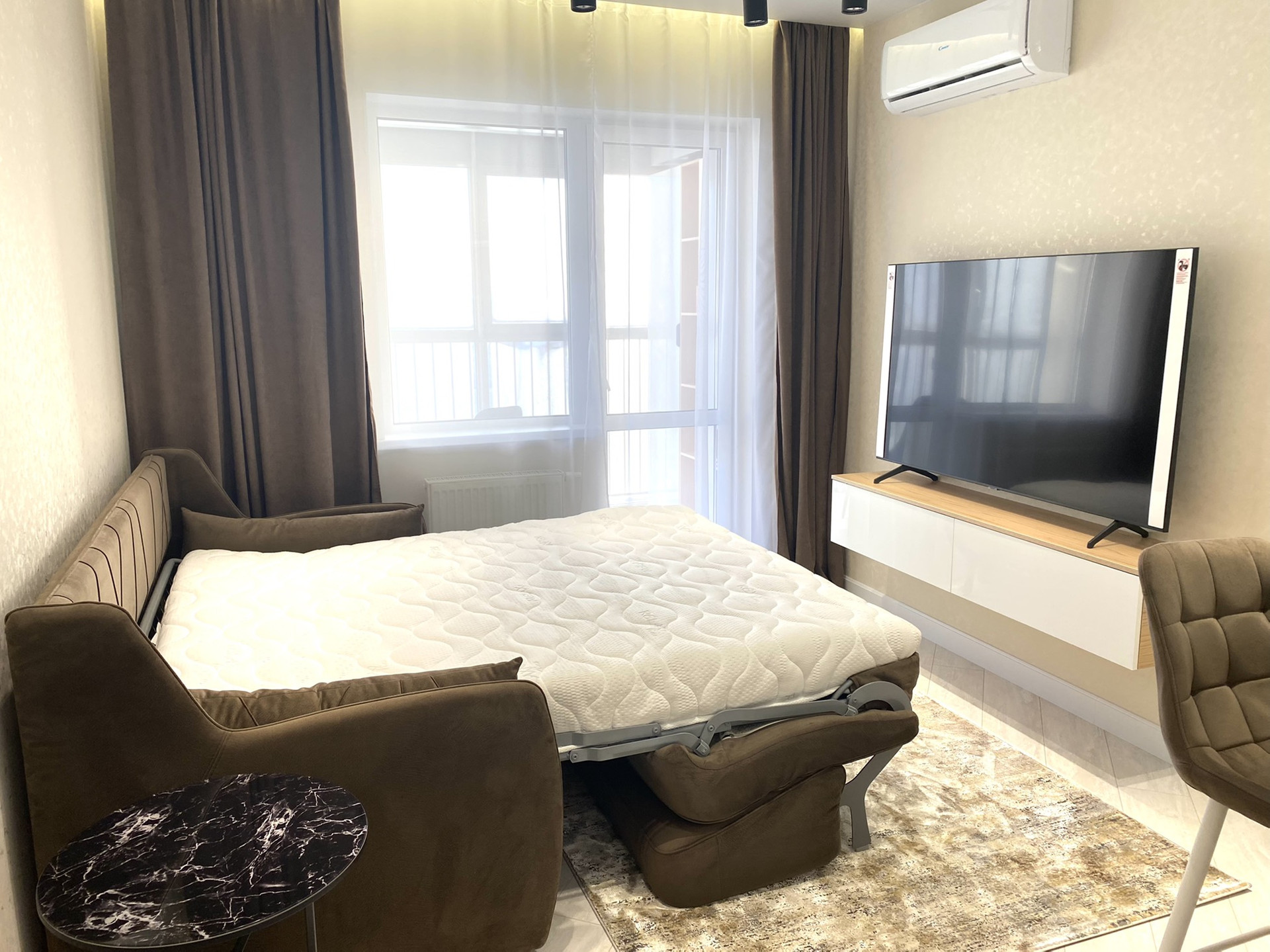 В зоне гостиной диван ОРМАТЕК, с функцией полноценной кровати и ортопедическим матрасом, телевизор sumsung 4k, диагональ 65 дюймов , кондиционер с охлаждением 35 кв.м.