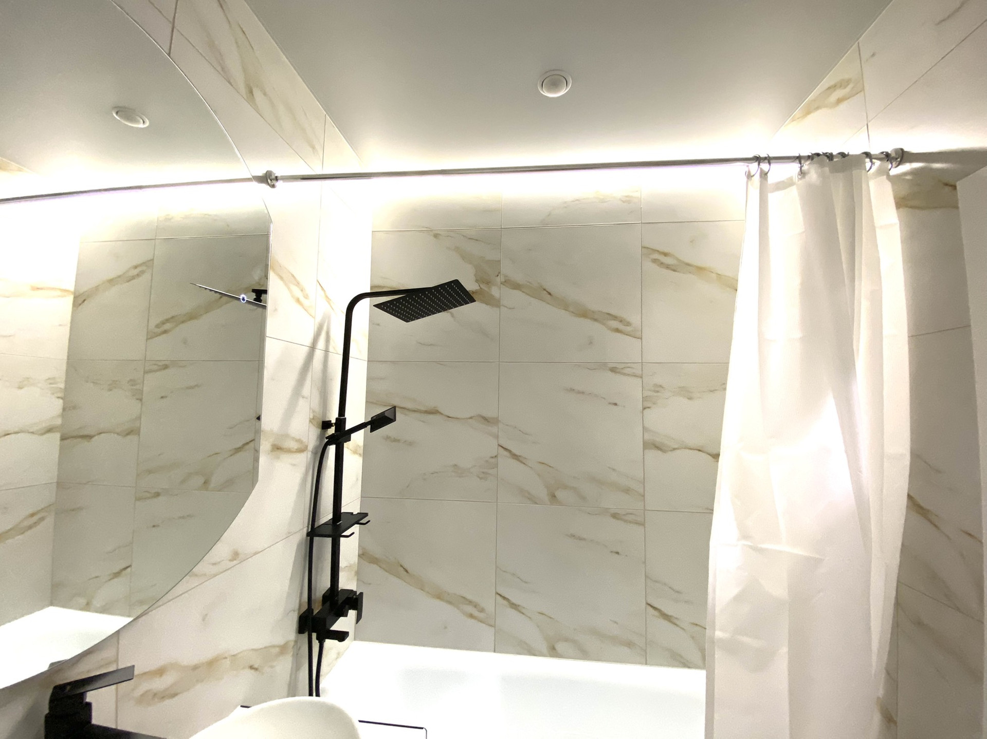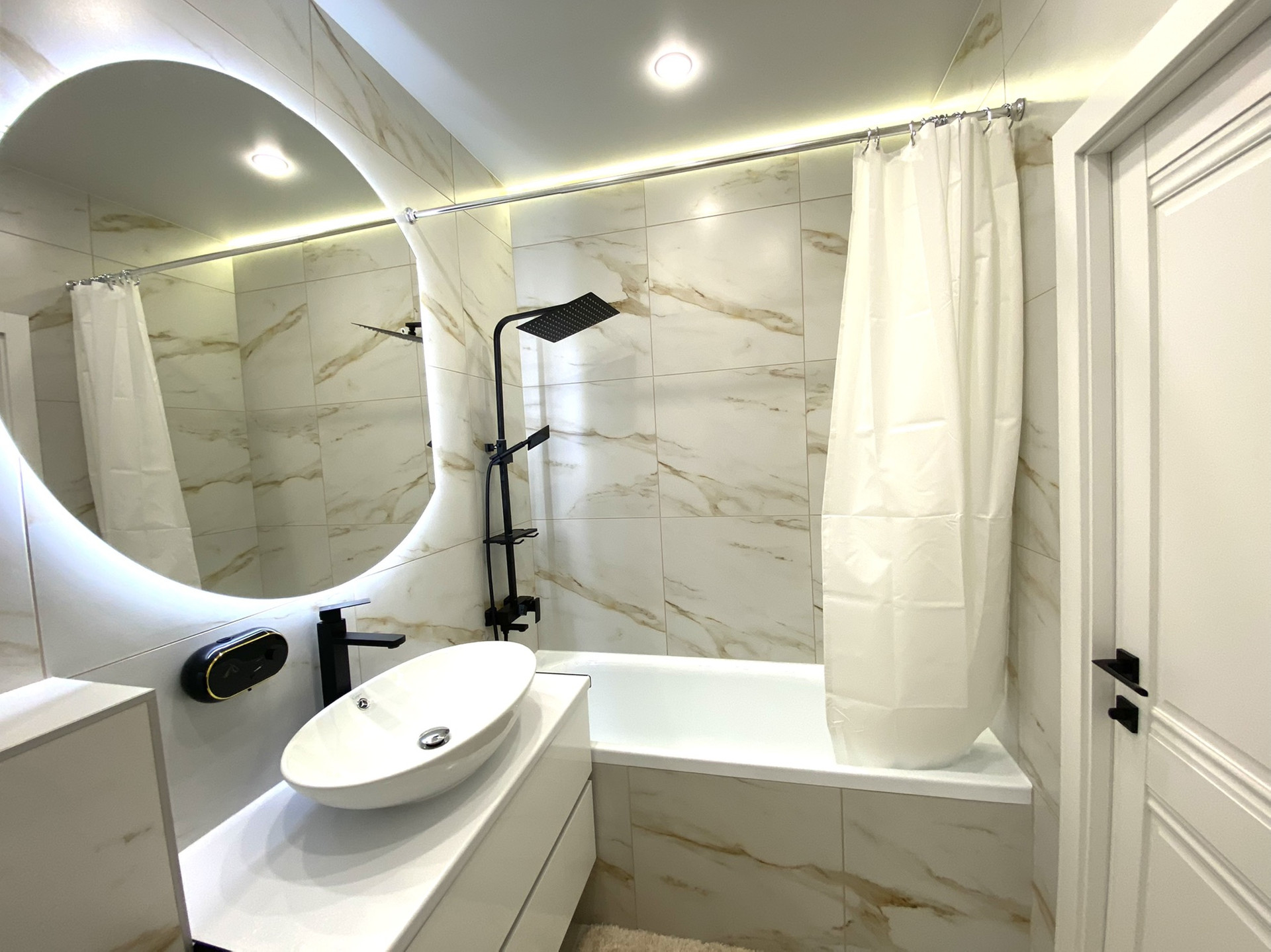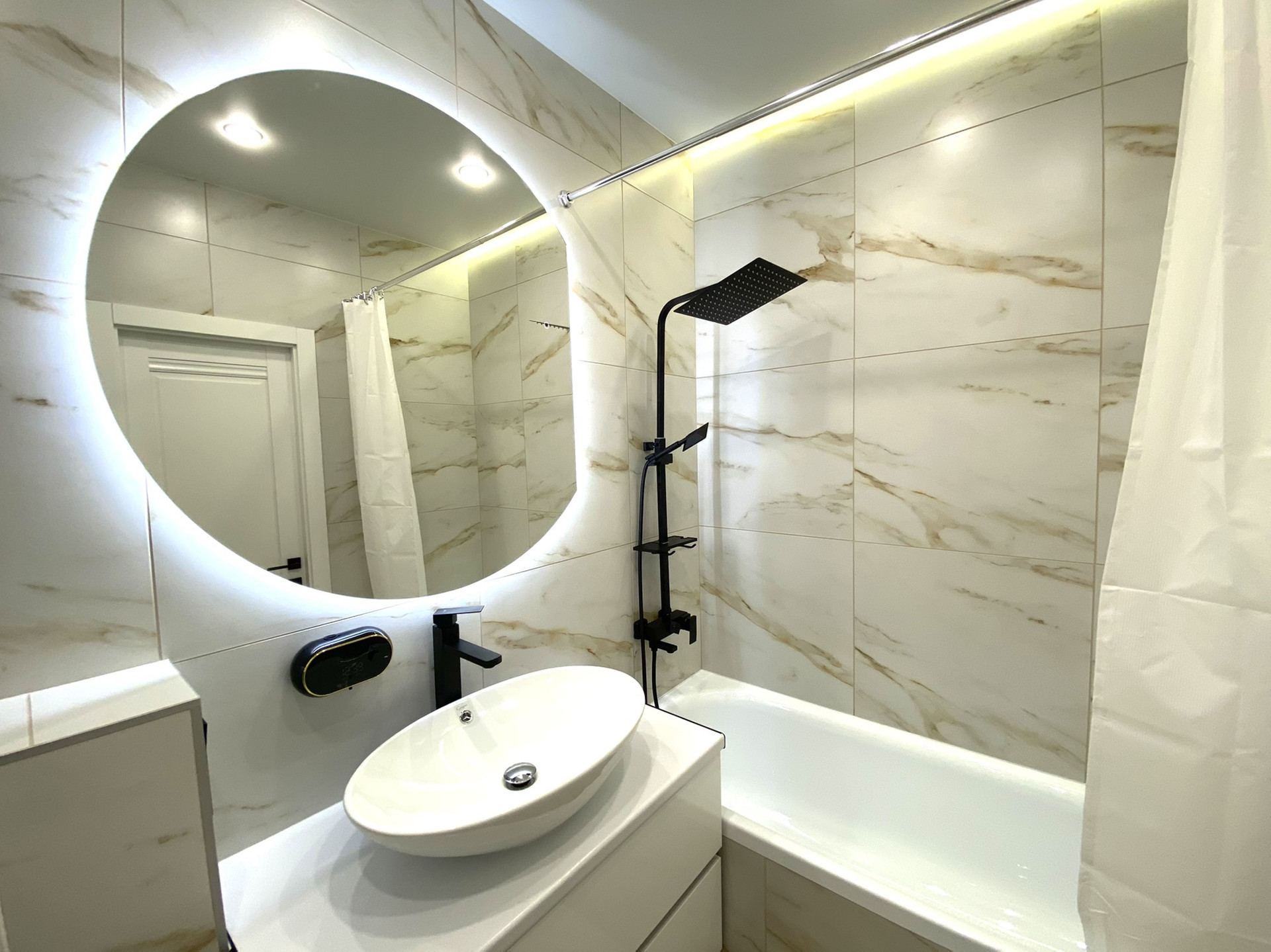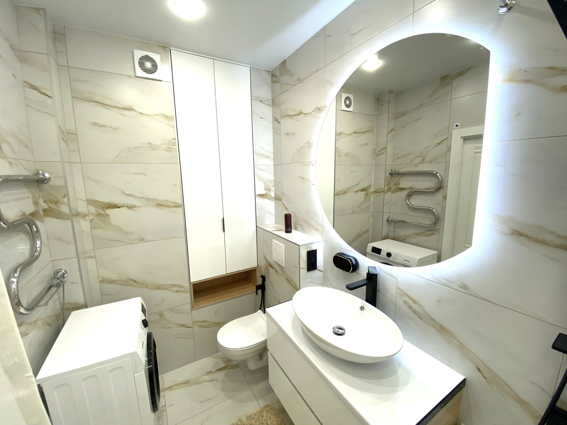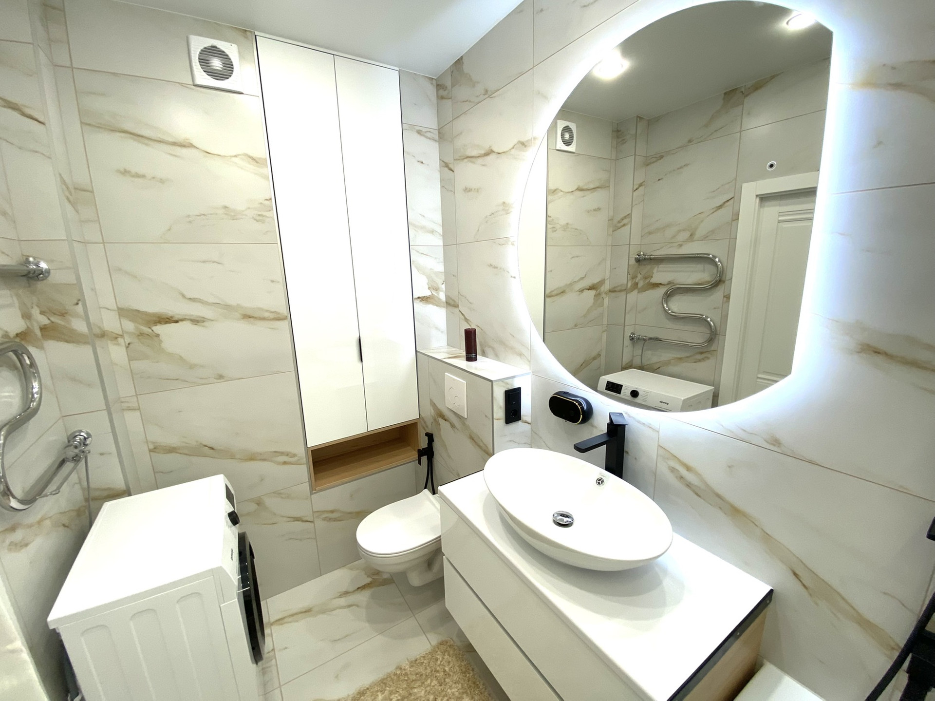✔ В ванной комнате керамогранит, тропический душ, гигиенический кран, зеркало с подсветкой, мебель для ванной, подвесной шкаф, бойлер, стиральная машина.