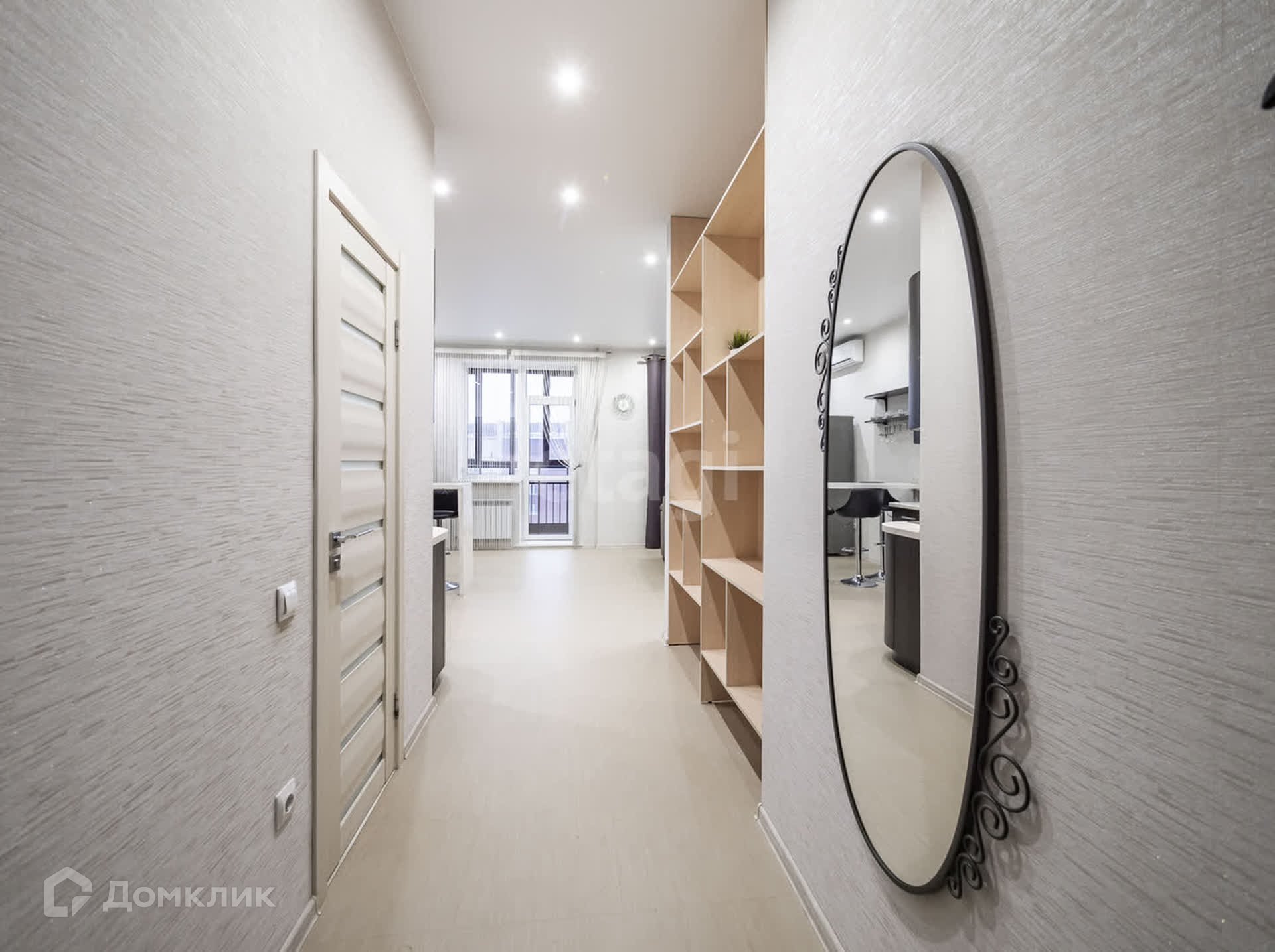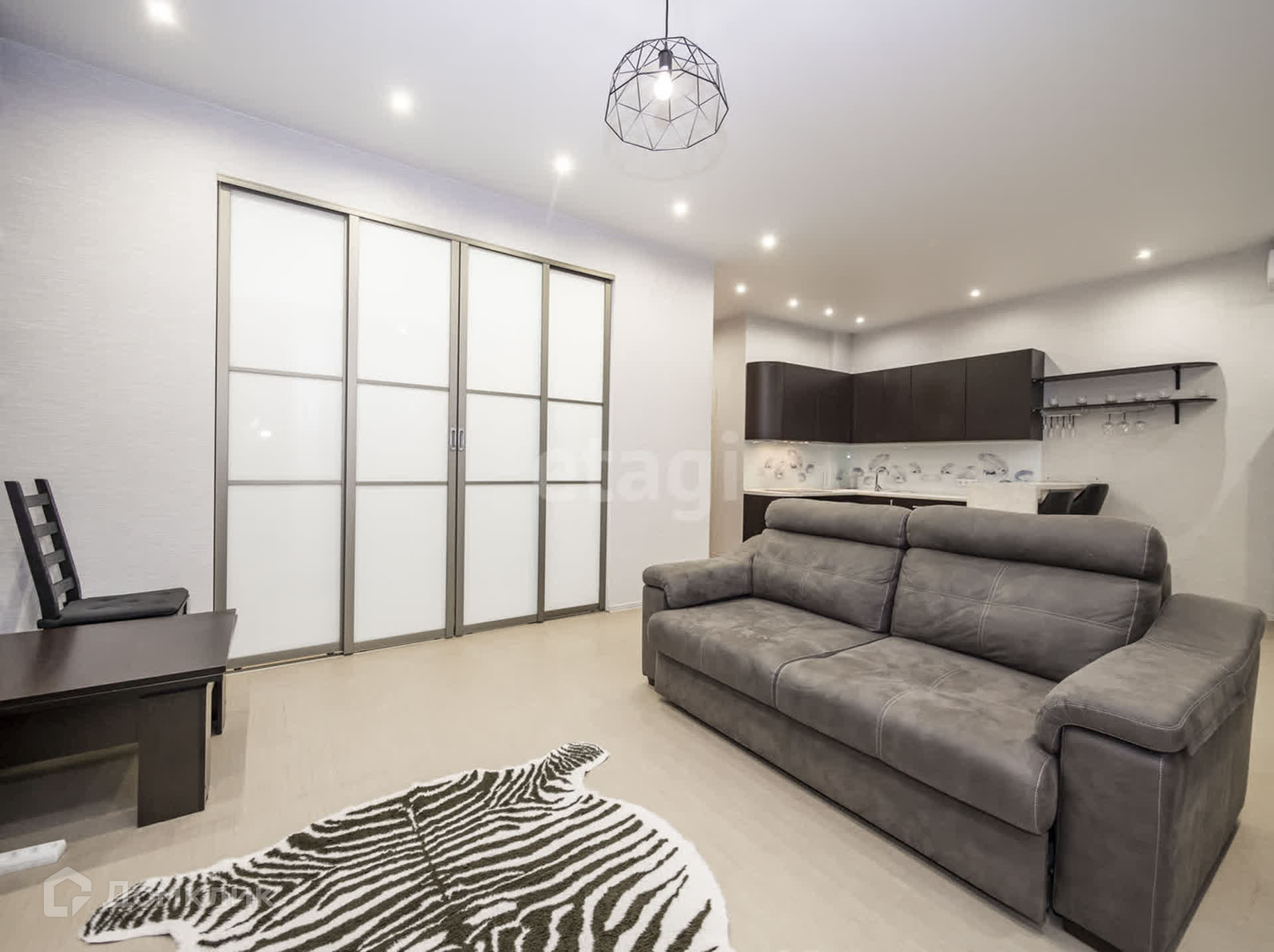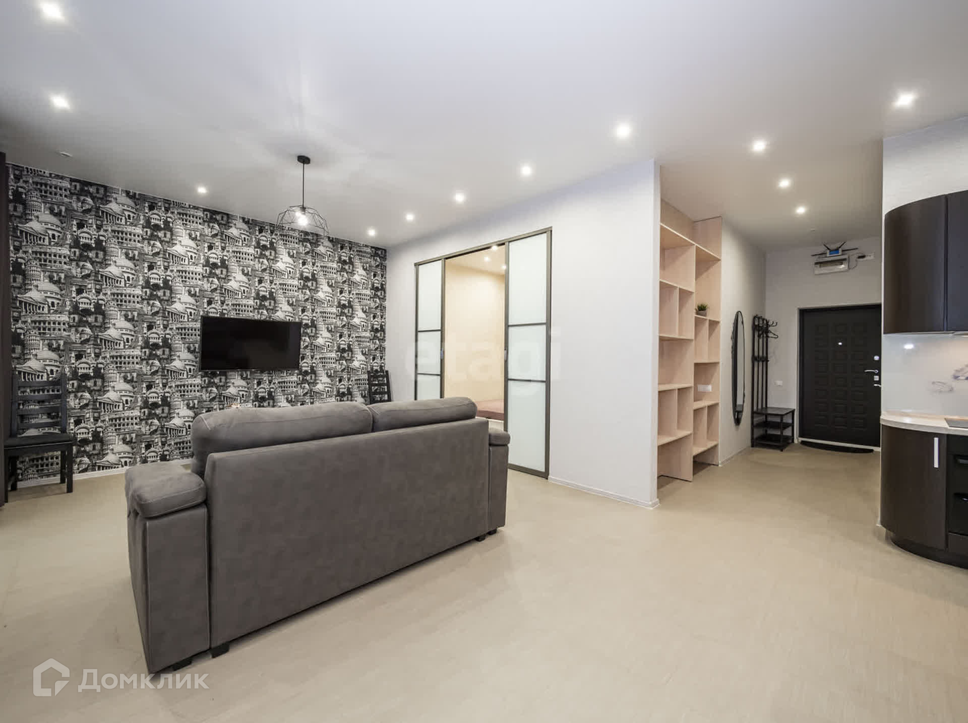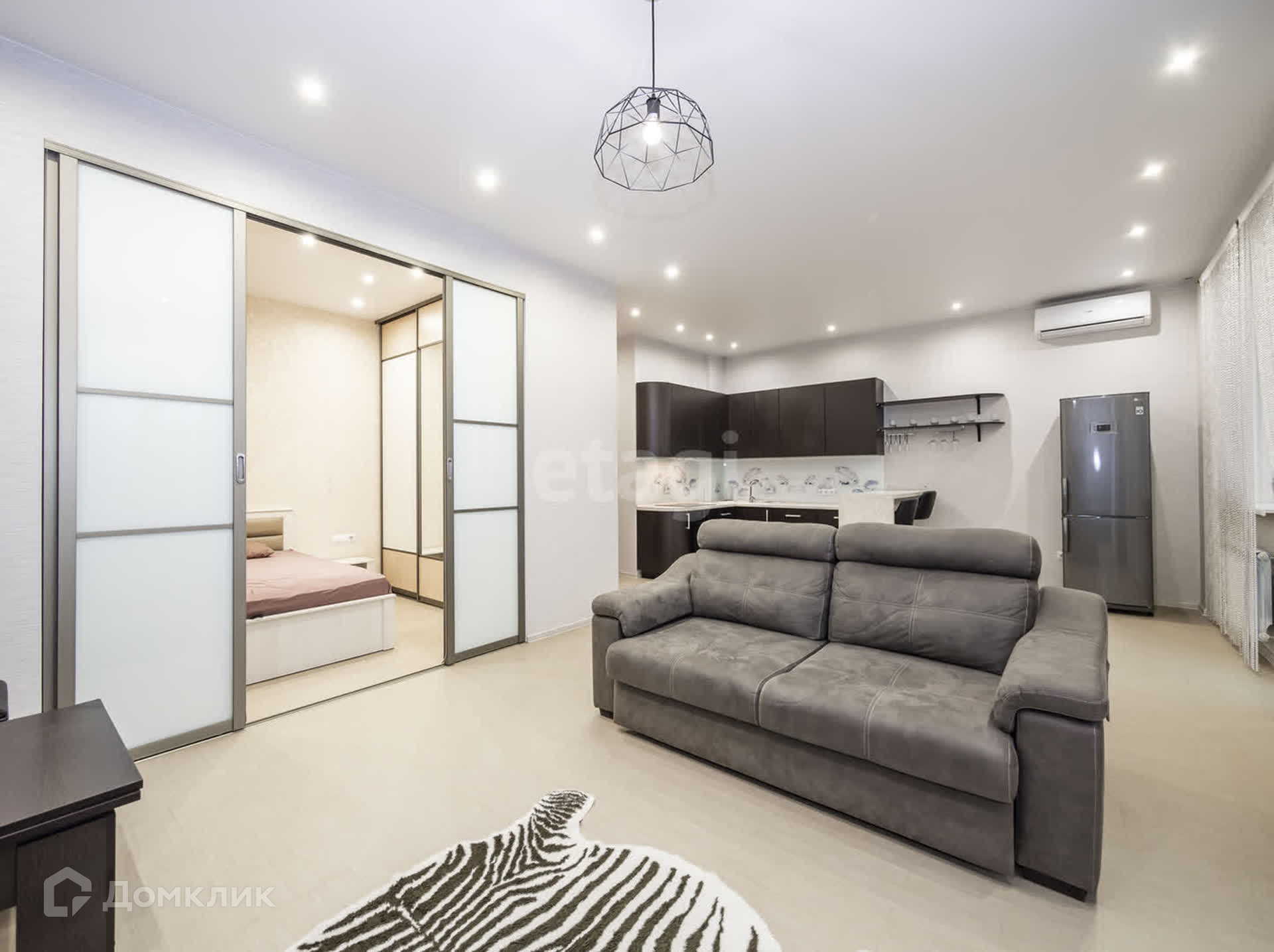 Отличное зонирование пространства в квартире: просторная кухня-гостинная, выделенная зона спальни и гардеробная.