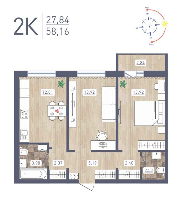 Общая площадь 58 м2