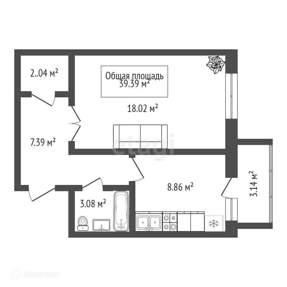 Общая площадь 39.7 м2