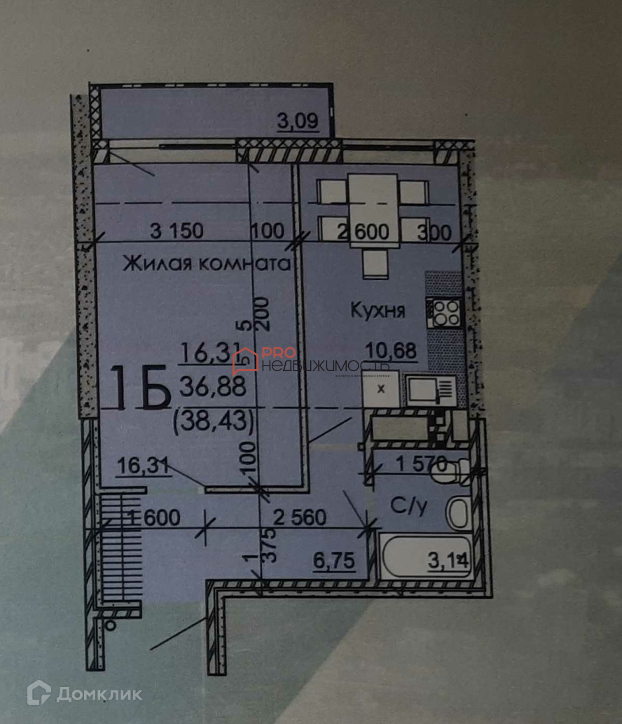Общая площадь 38.43 м2