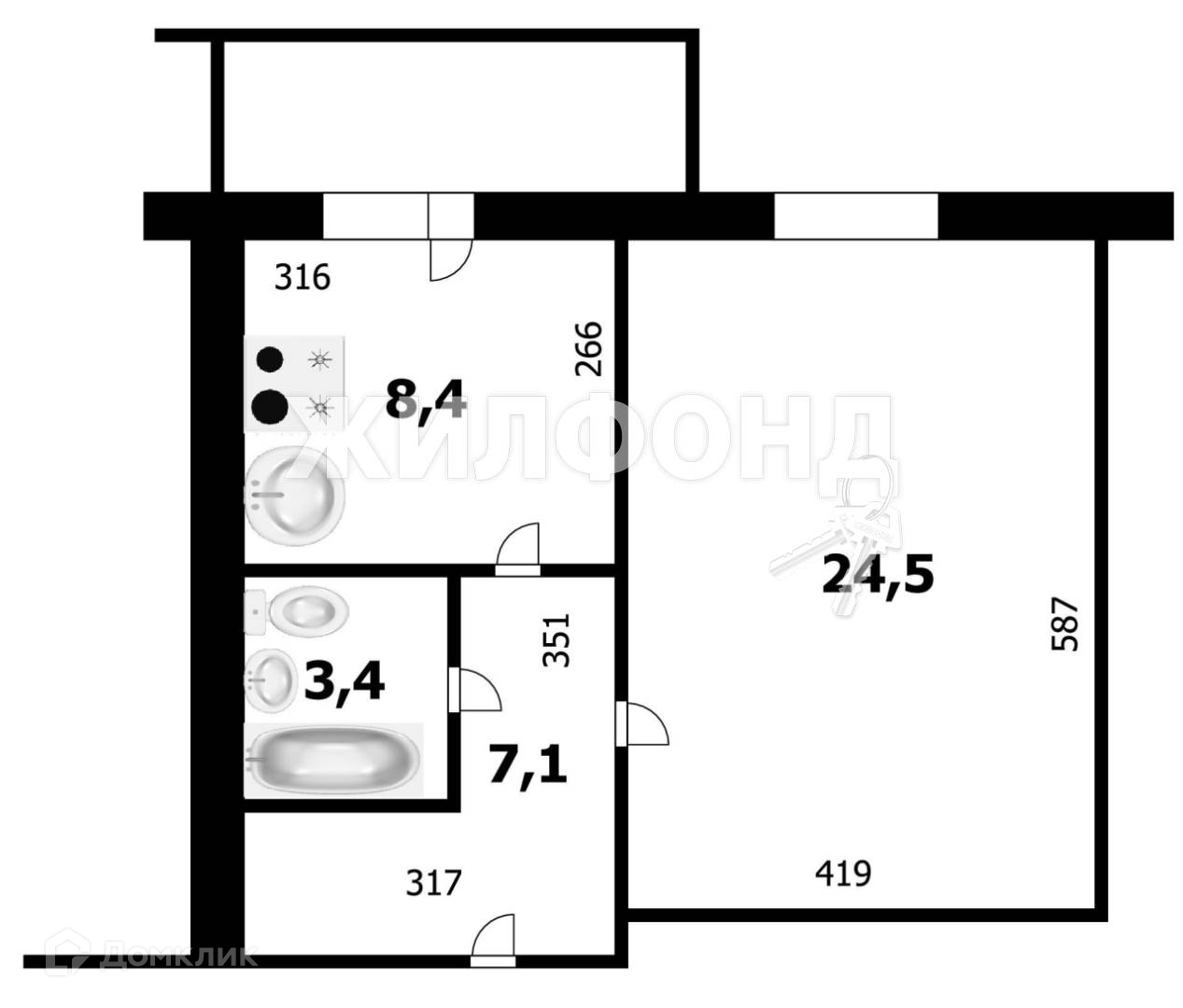 Жилая площадь 24.5 м2