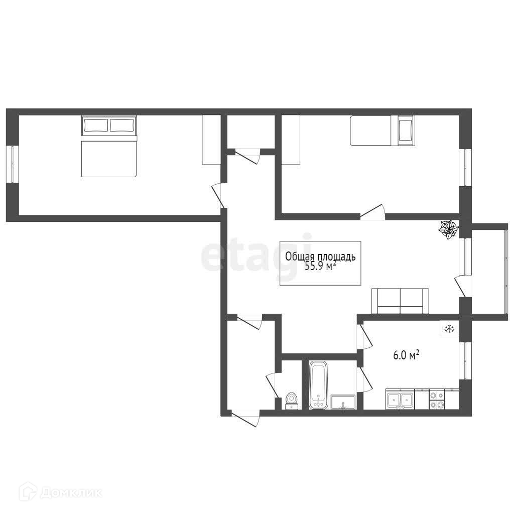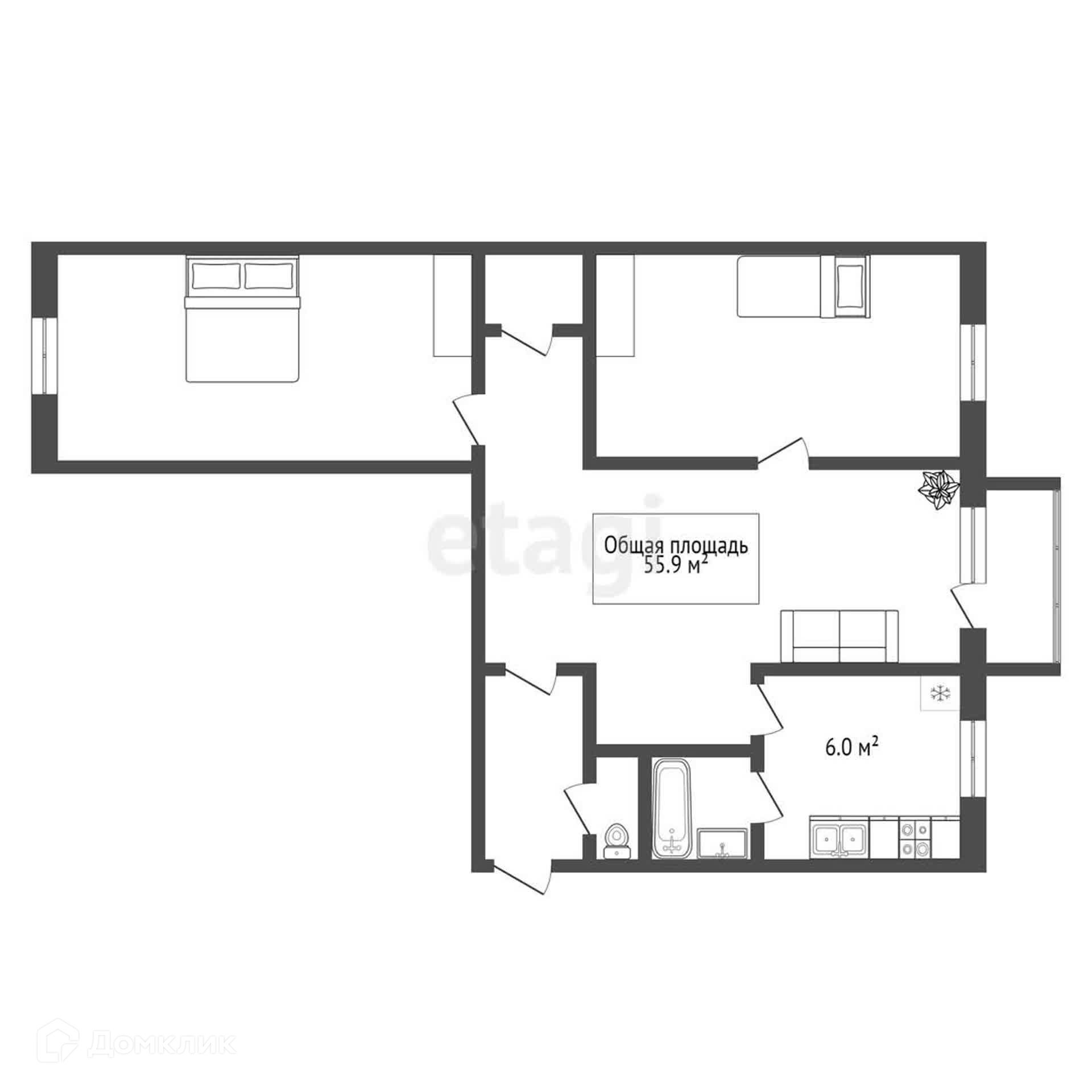 Общая площадь 55.9 м2