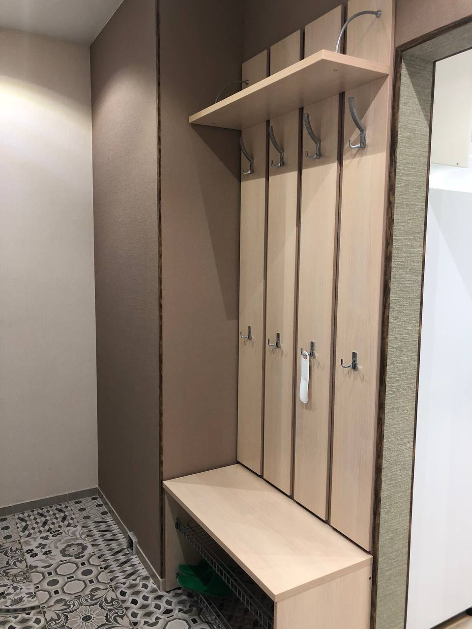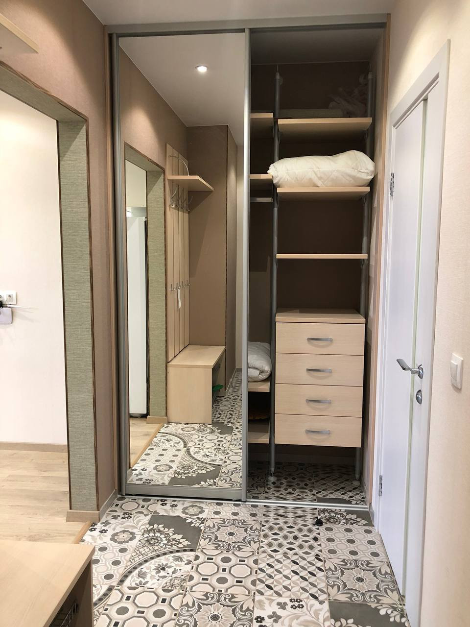 В коридоре: прихожая, глубокий шкаф с зеркальными дверьми.