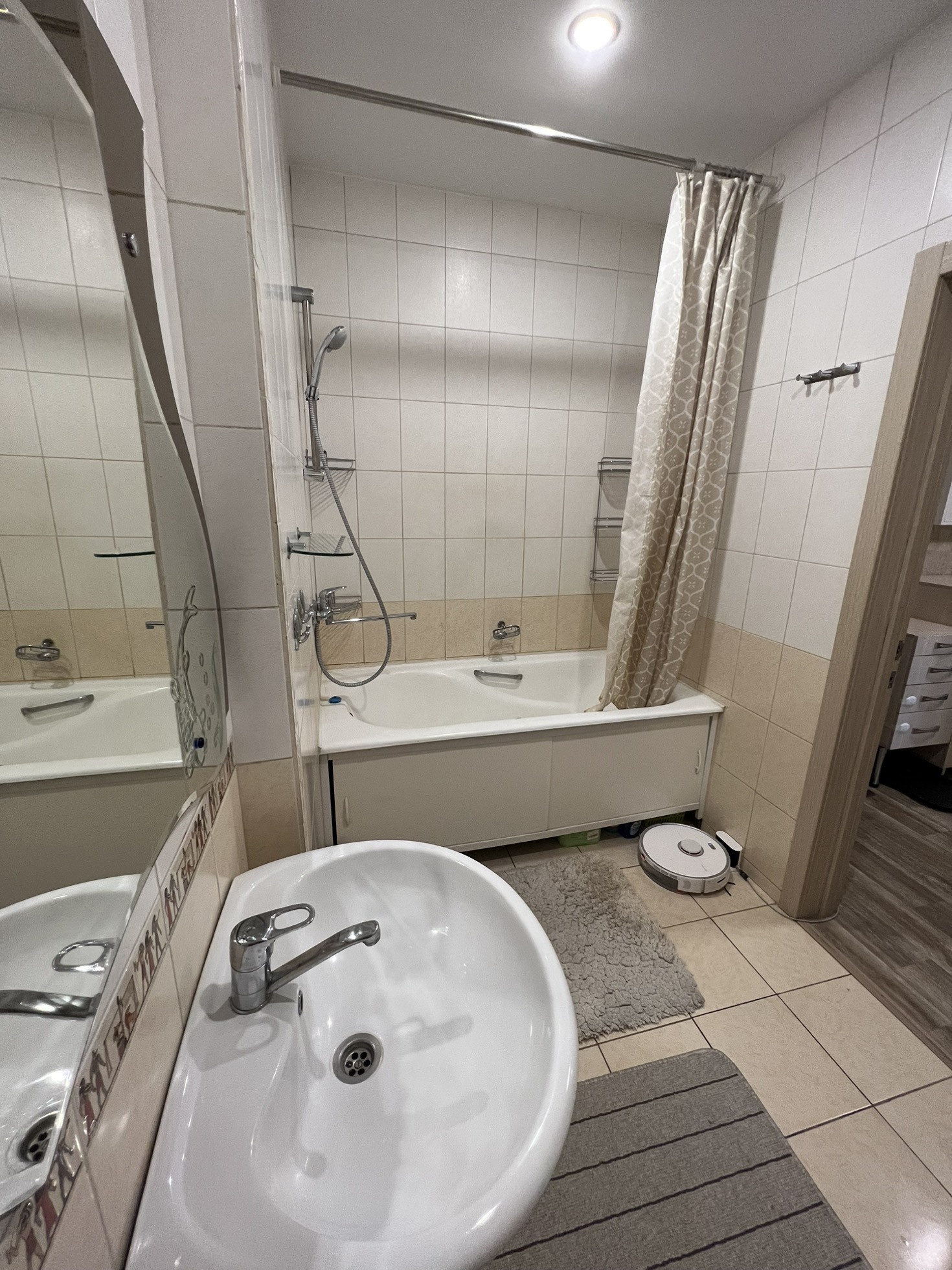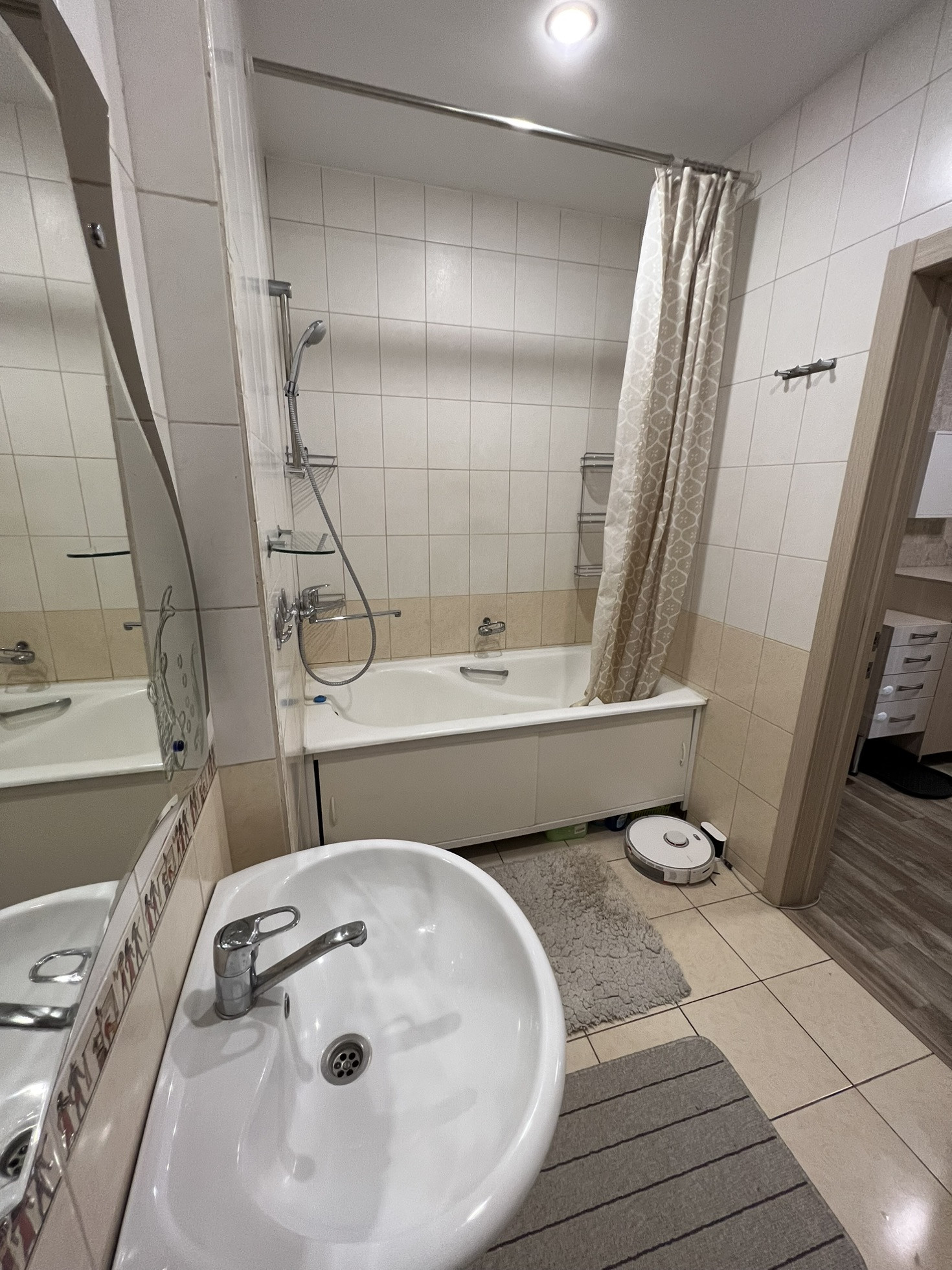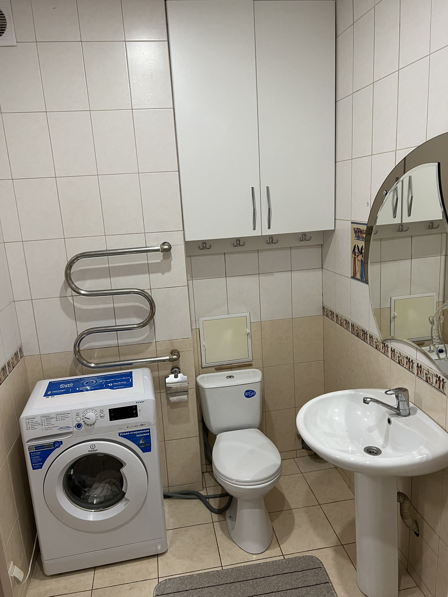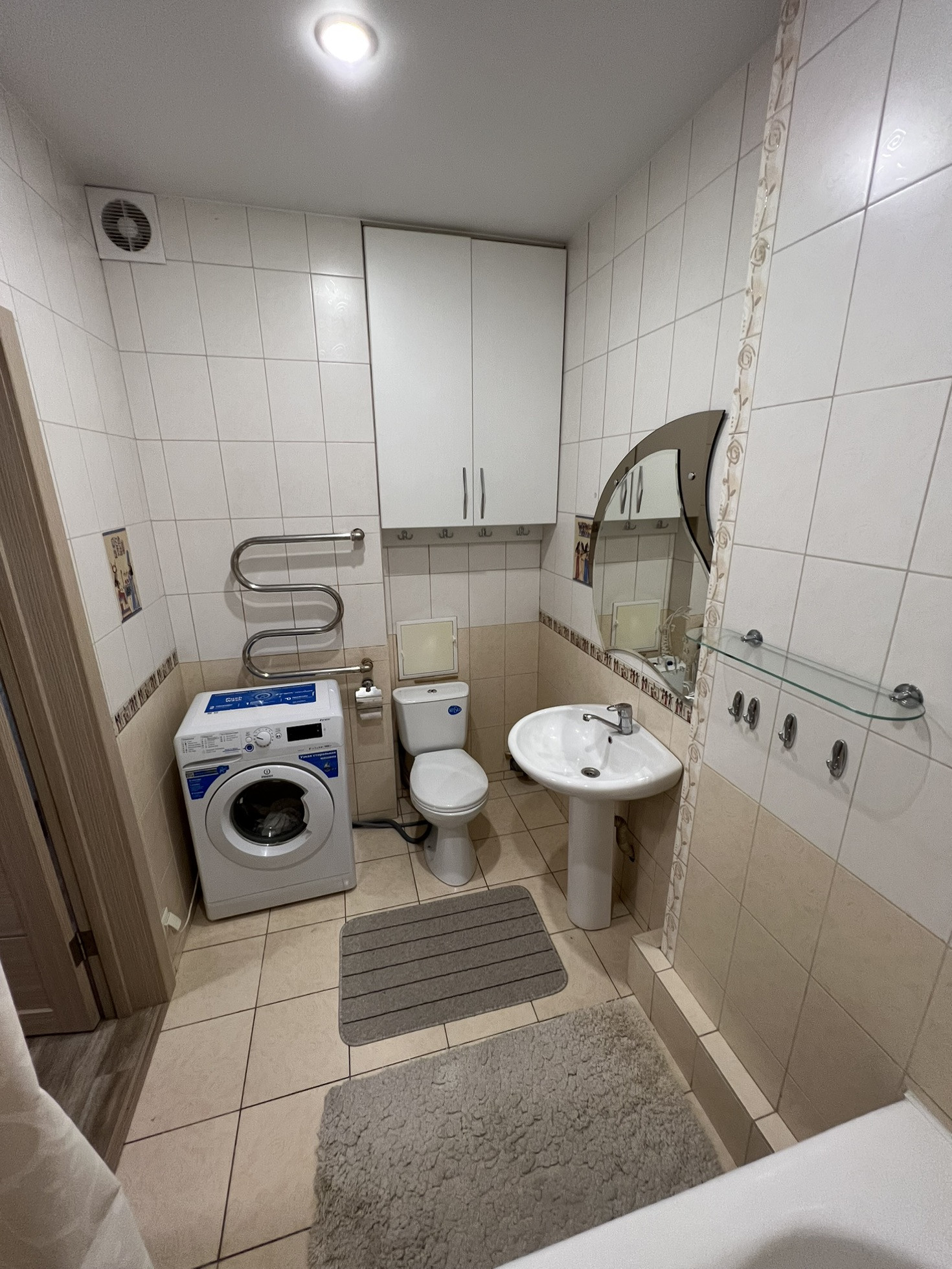 - просторная ванная комната с санузлом 5,1кв , под ванной находится отсек для хранения бытовой химии и над унитазом большой шкаф , остается стиральная машинка . стоят приборы учета