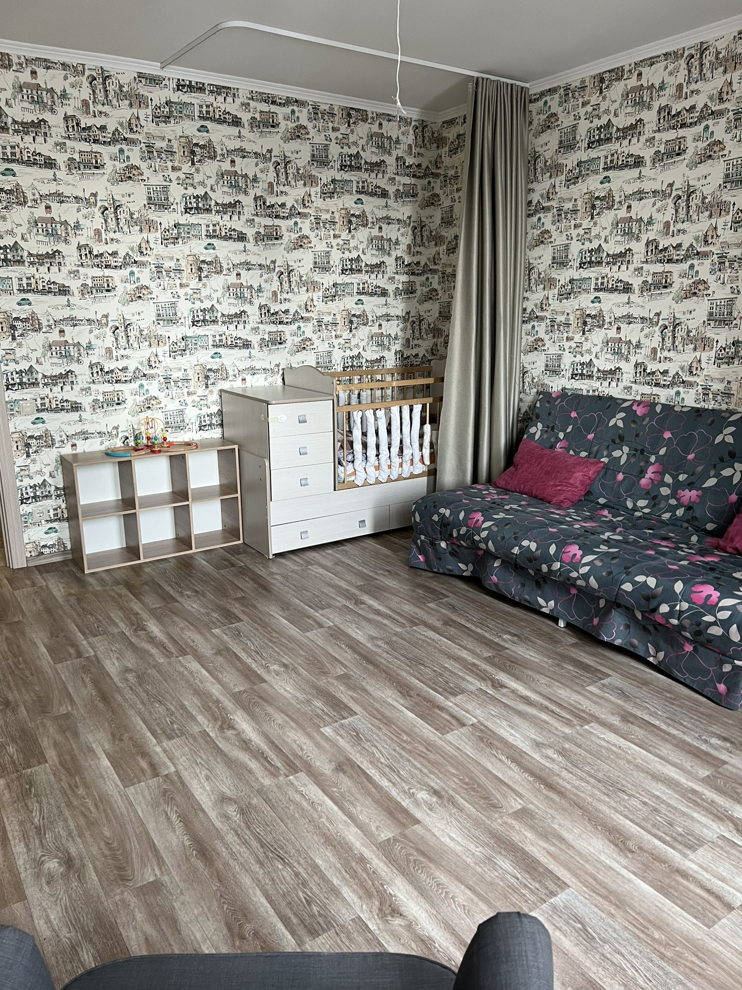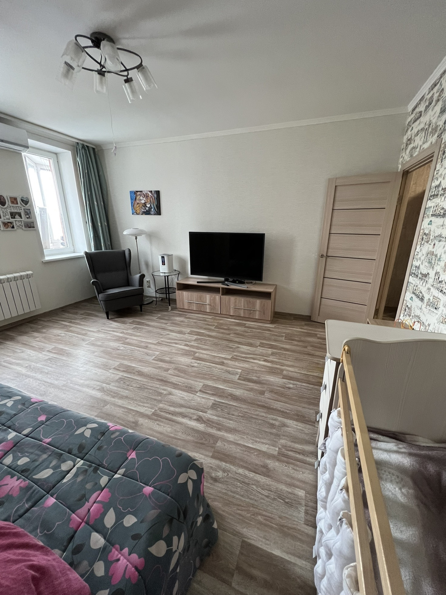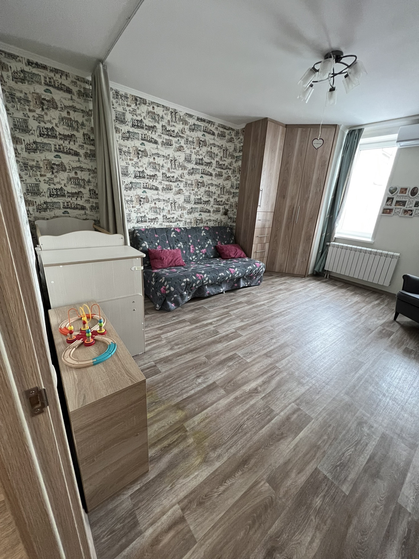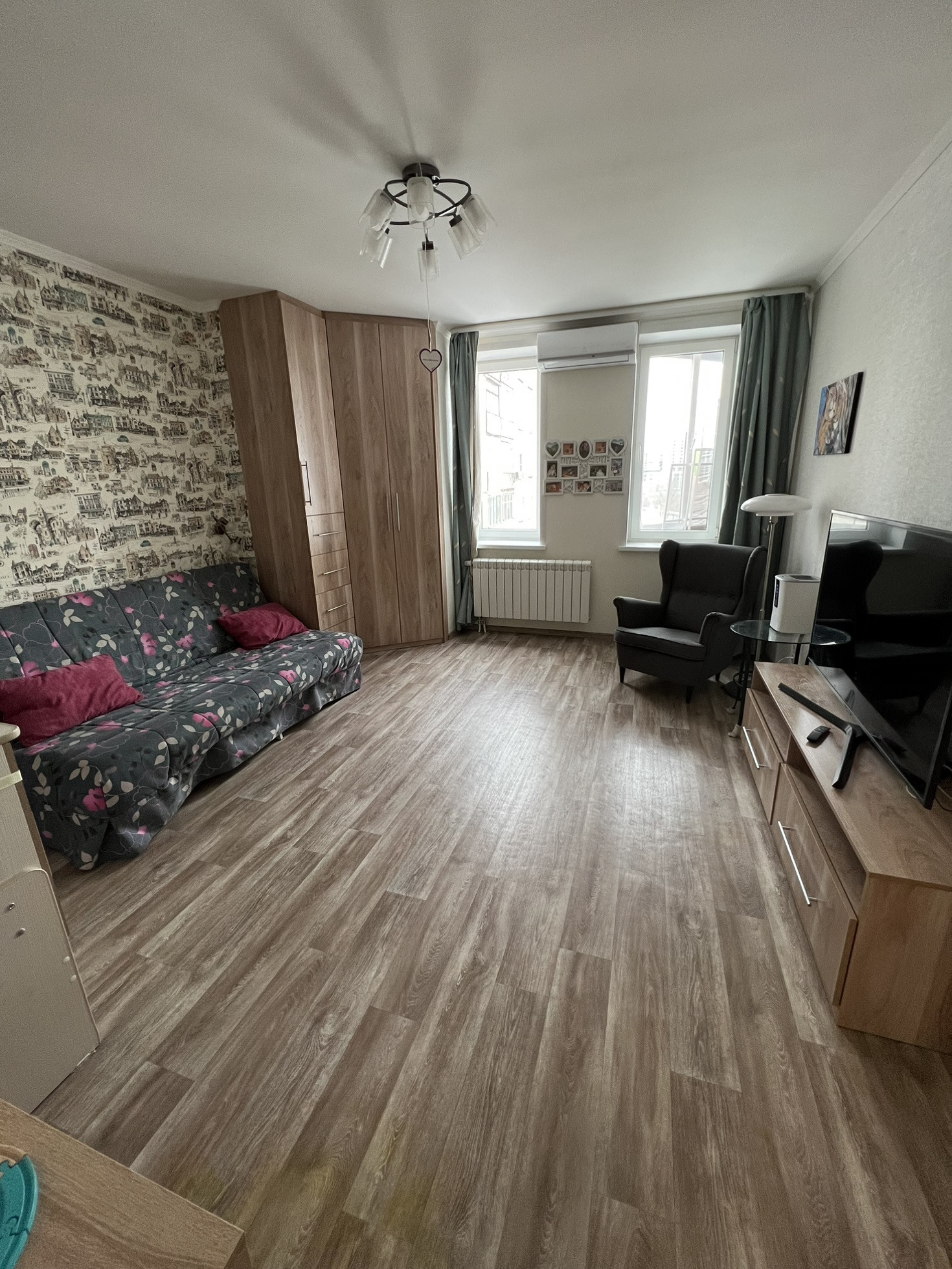 - зал 20кв , правильной квадратной формы , 2 окна , солнечная сторона , одно окно на улицу , второе на балкон , в комнате установлен кондиционер, большая встроенная гардеробная , шумоизоляция, новые батареи, сделана направляющая с темными шторами чтоб закрывать детскую кроватку (при отсутствии надобности легко снимается).