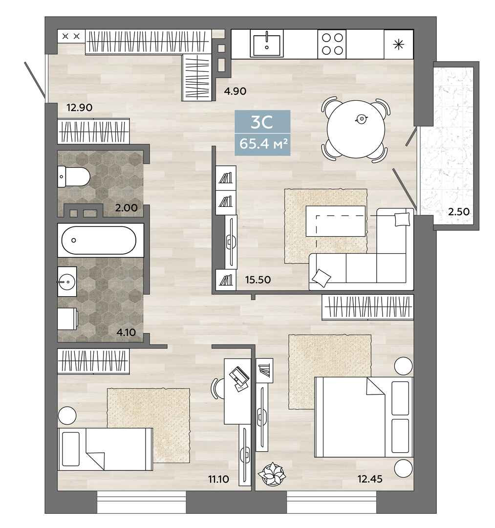 Общая площадь 65.4 м2
