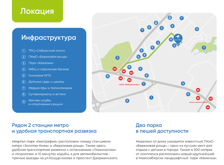 ЖК «Биография» от застройщика «ЗАО СМС» расположен в городе Новосибирск в Дзержинском районе. Комплекс ограничен улицами Королёва — Поселковая — Гоголя и имеет удобную дорожно-транспортную развязку, обеспечивающую связь со всеми районами города.