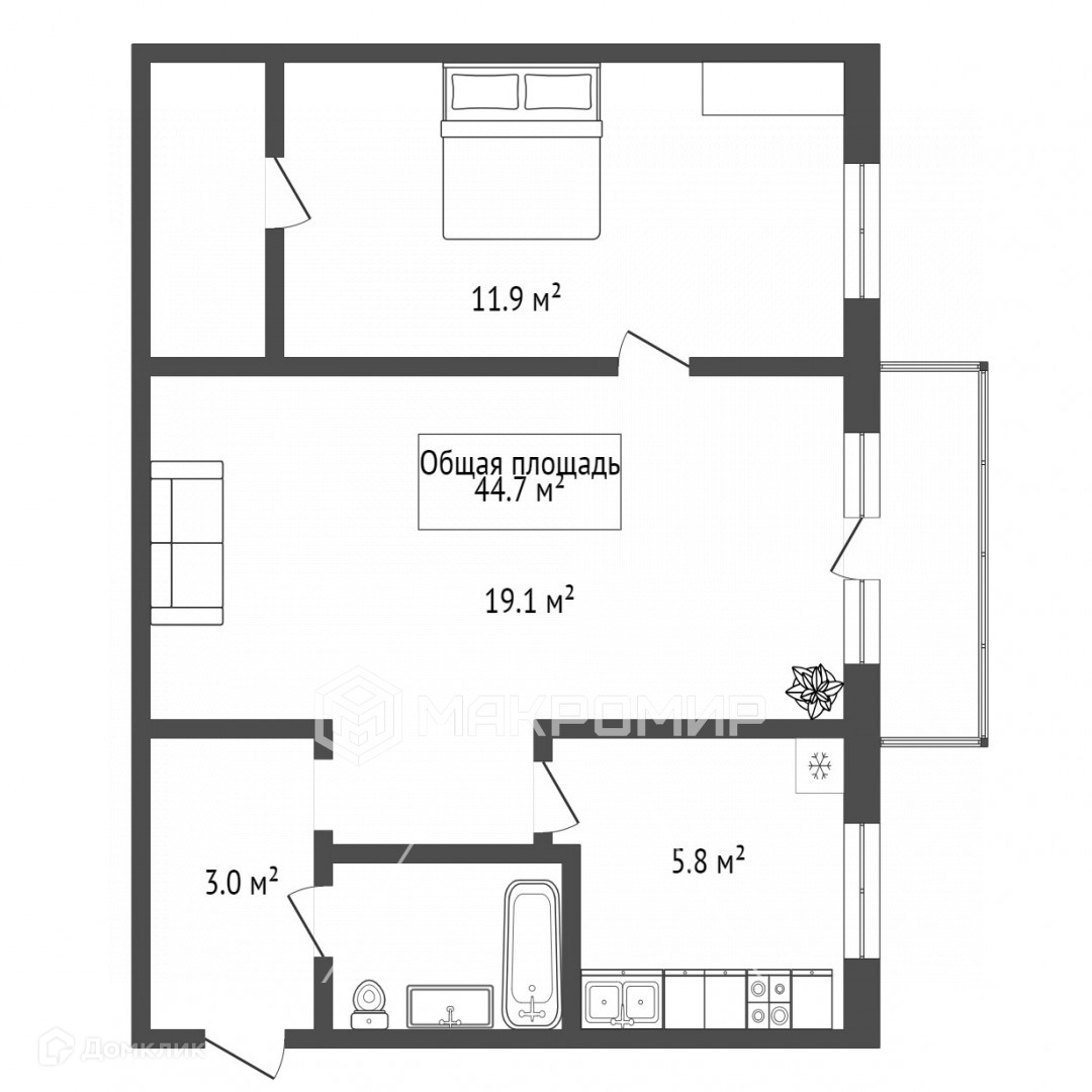 Общая площадь 44.7 м2