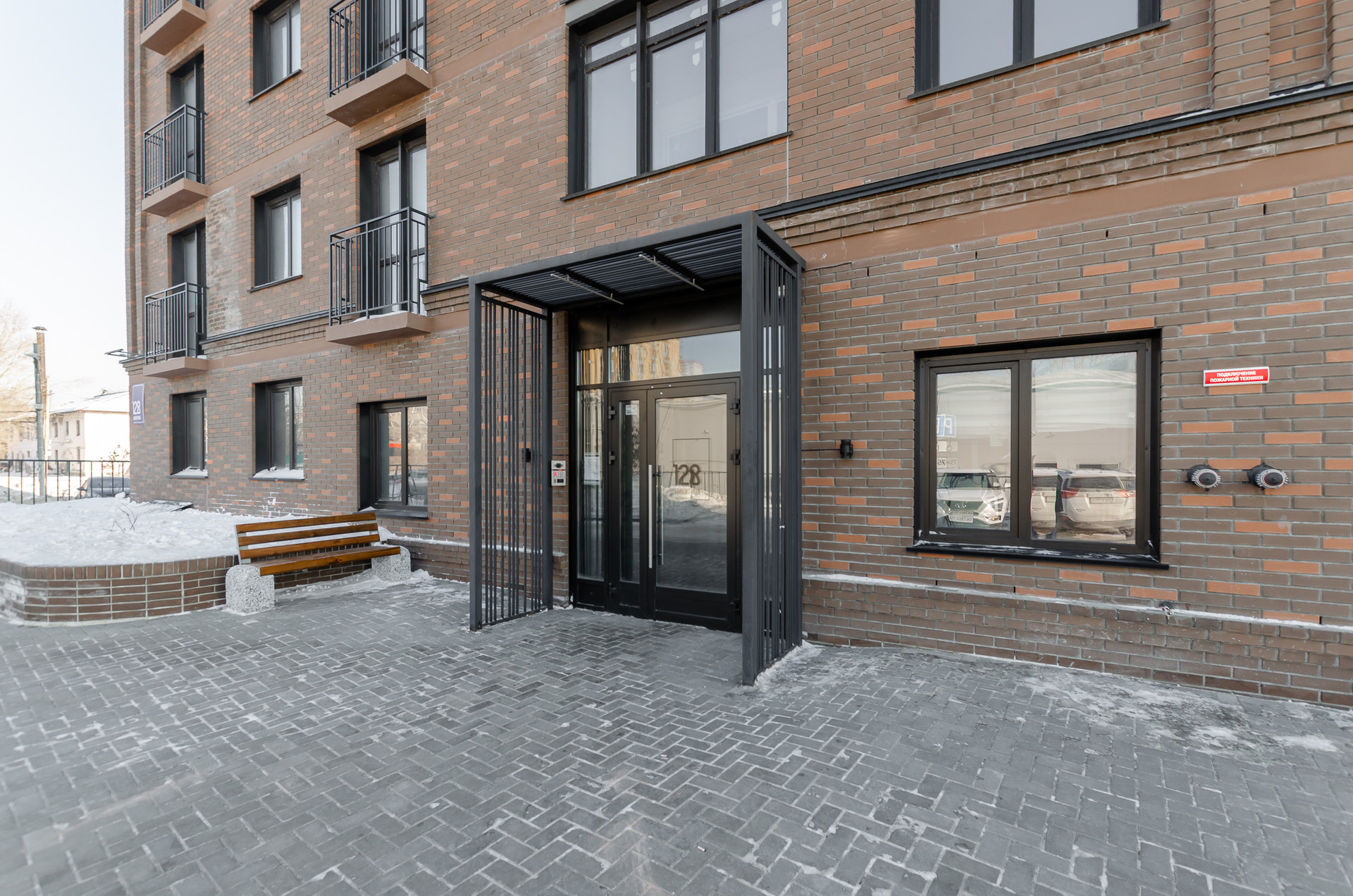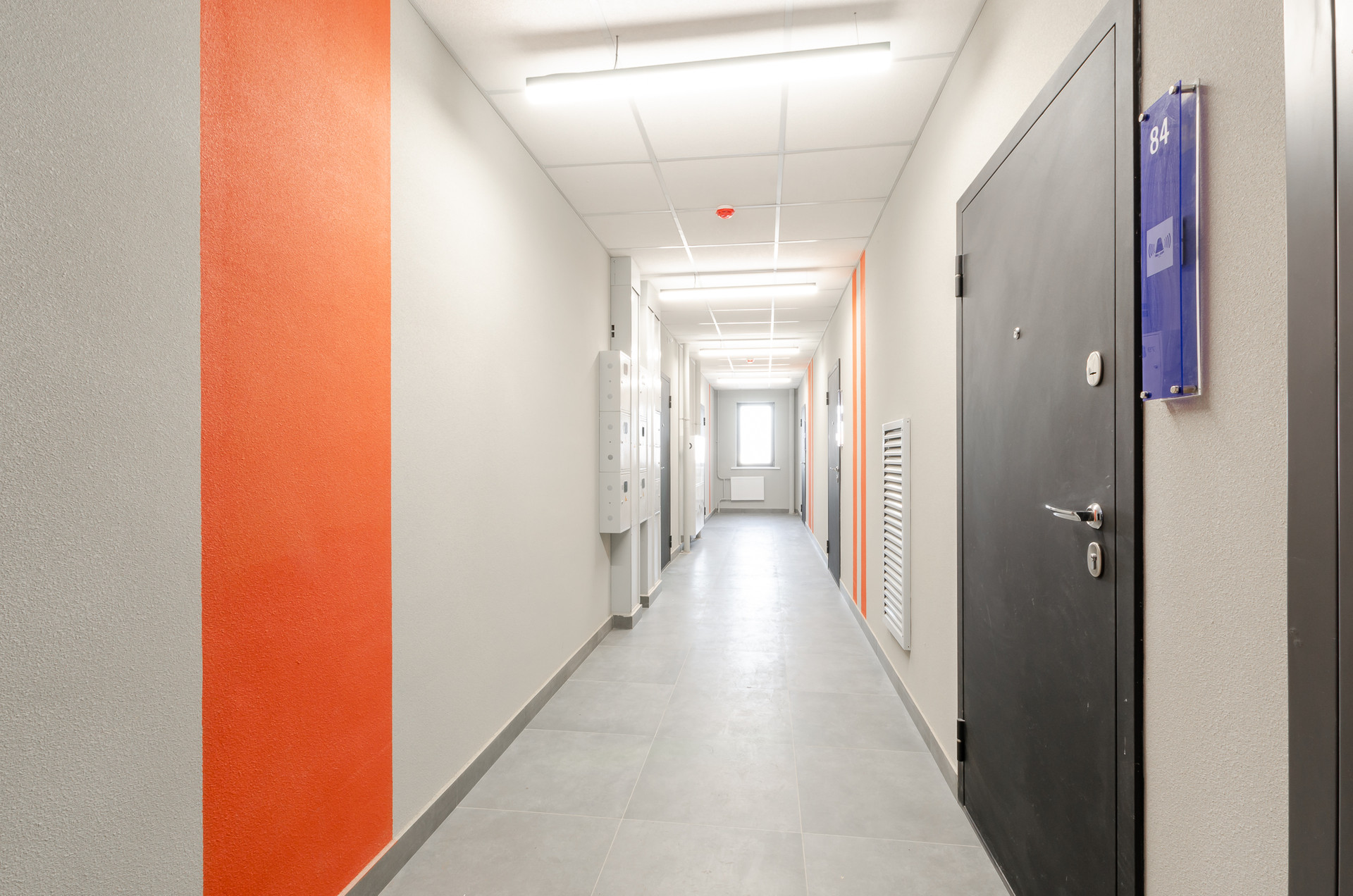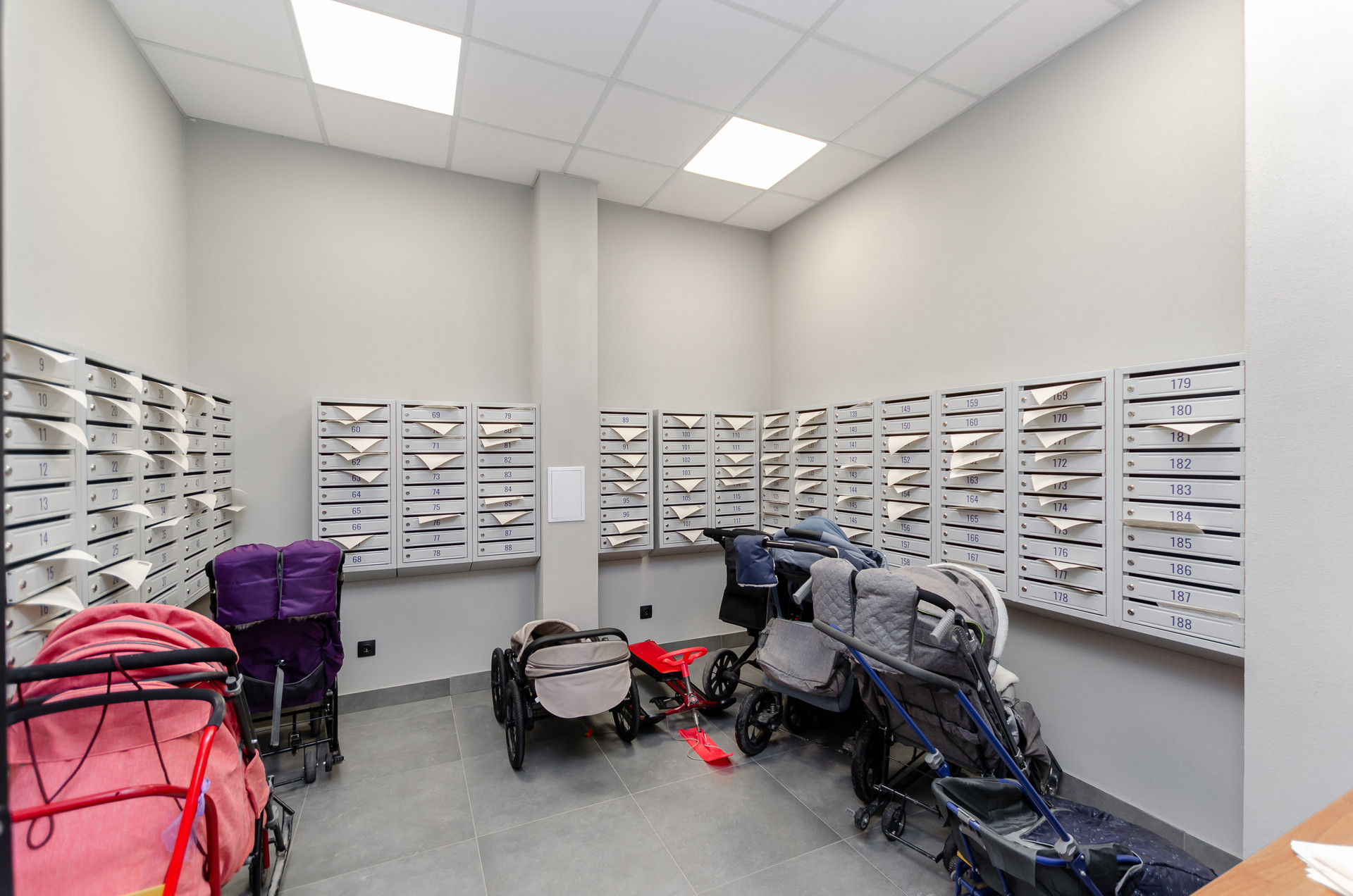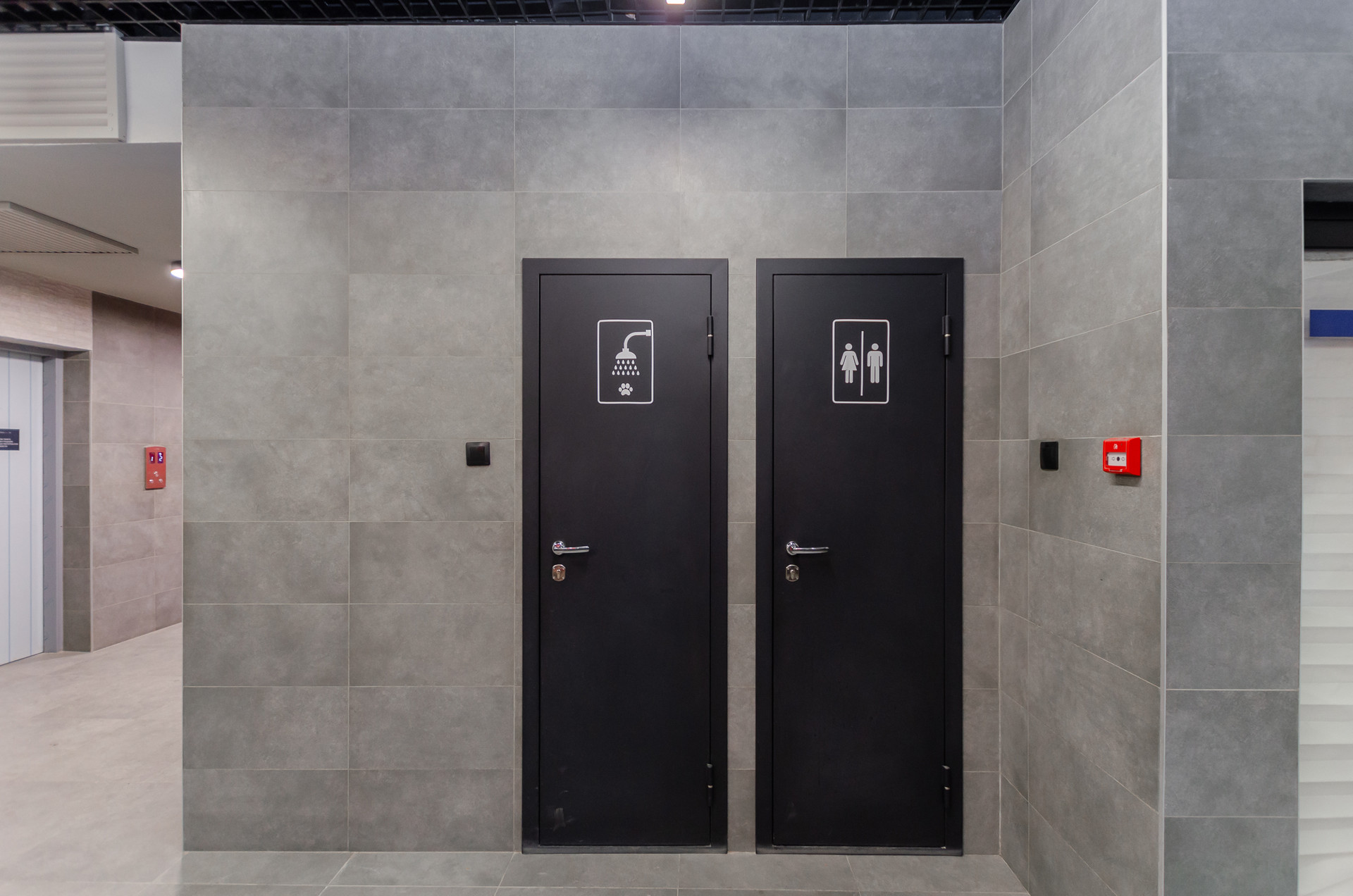 На первом этаже консьерж, есть отдельное помещение для мытья лап собакам, зона размещения почтовых ящиков, управляющая компания.