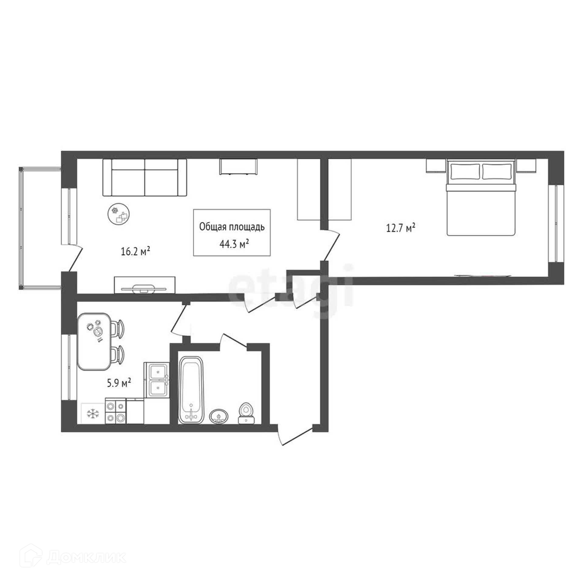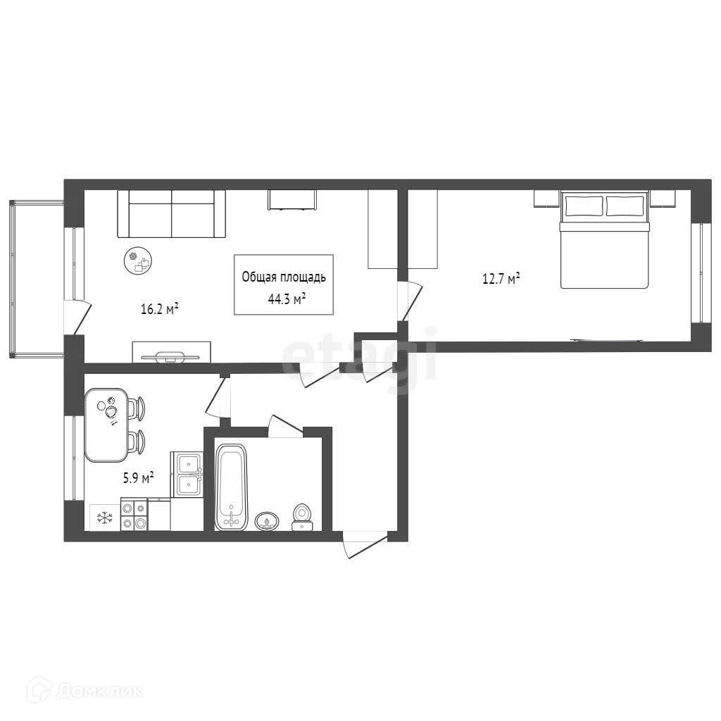 Общая площадь 44.3 м2