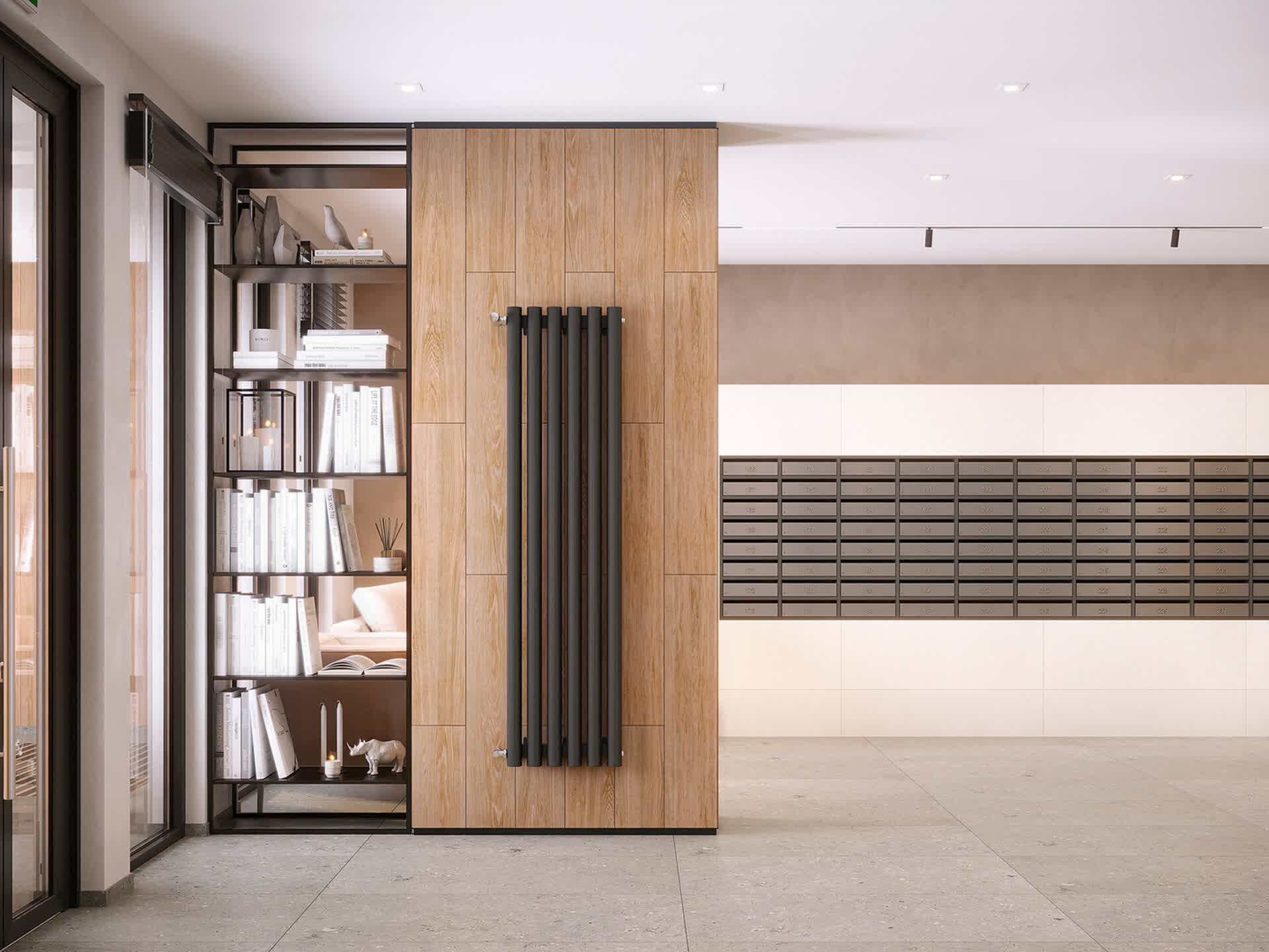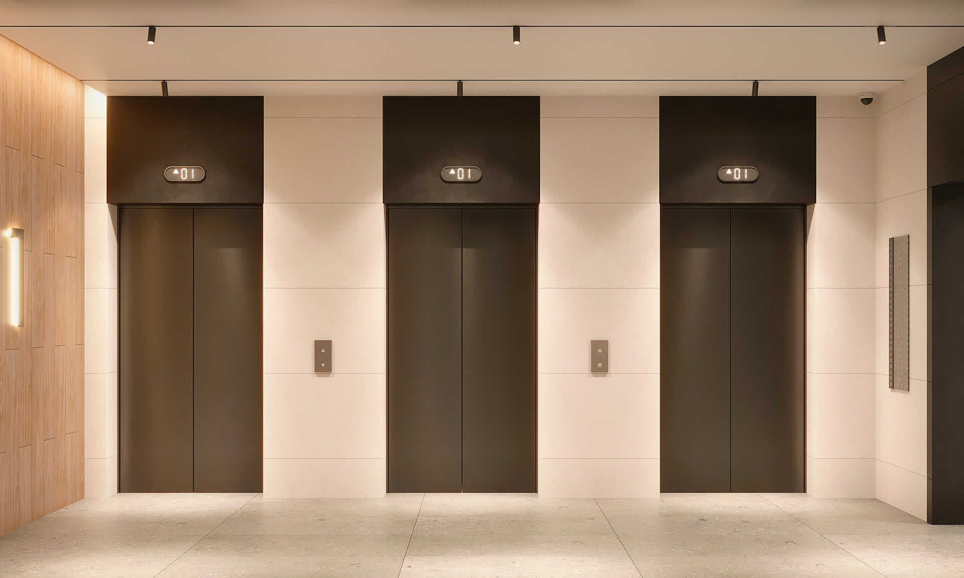 Авторский дизайн холлов сочетает натуральные оттенки и фактуры дерева, керамогранита, декоративной штукатурки. Обилие света и воздуха создает сочетание стеклянных и зеркальных элементов со стильной трековой подсветкой, дополненной акцентными бра. Мягкие зоны в таком антураже особенно уютны и удобны для коротких встреч или ожидания курьера.