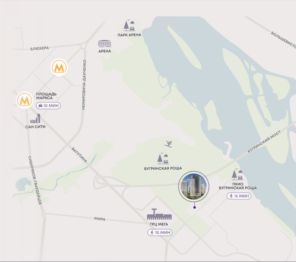 Насыщенные семейные выходные круглый год – это просто, когда рядом с домом парк «Бугринская роща». Летом поблизости благоустроенный пляж, зимой – лыжная база, каток в парке с видом на Обь. Инфраструктура и развлечения правого берега в быстром доступе, благодаря удобному выезду на Бугринский мост.