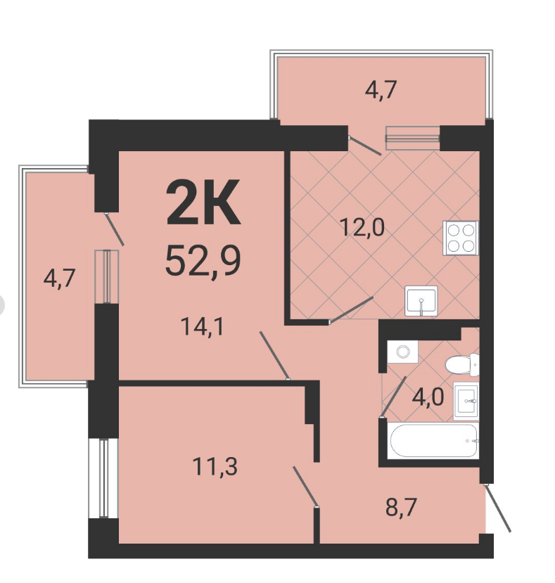 Общая площадь 52.9 м2