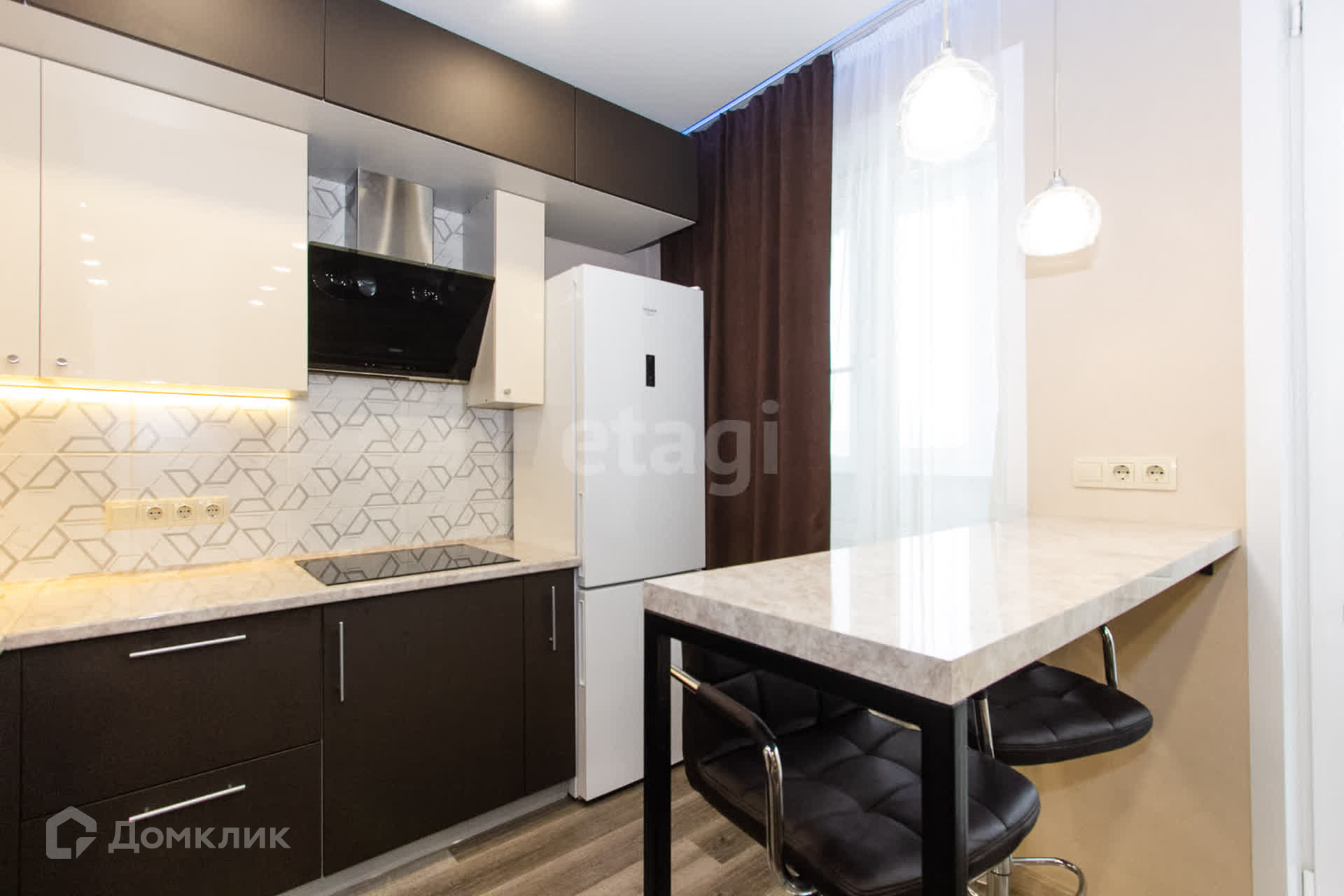 Удобное зонирование, кухня отделена барной стойкой.