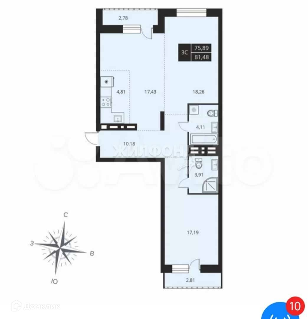 3-комнатная квартира, 75.89 м2, этаж 24 / 25, на продажу в Новосибирске, улица Семьи Шамшиных, 91
