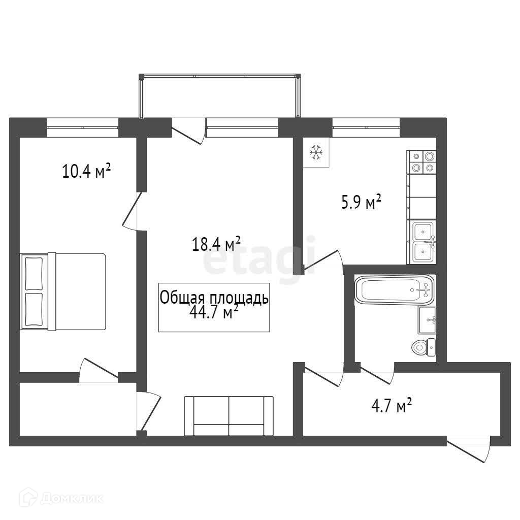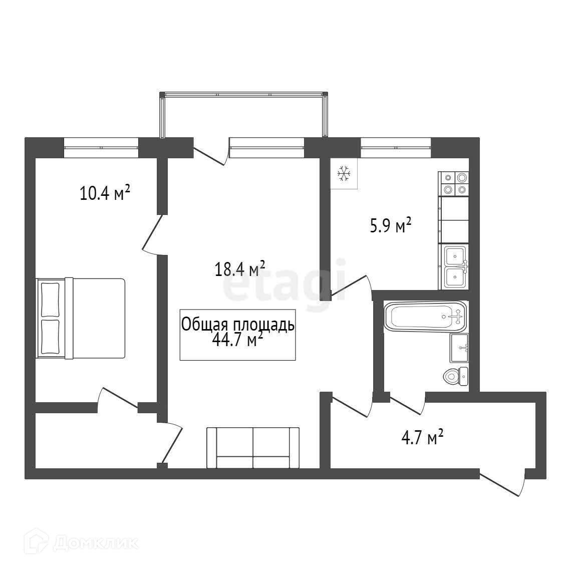 Общая площадь 44.7 м2