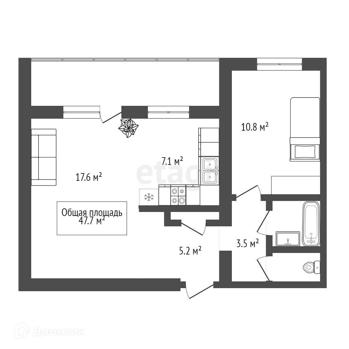 Общая площадь 47.7 м2