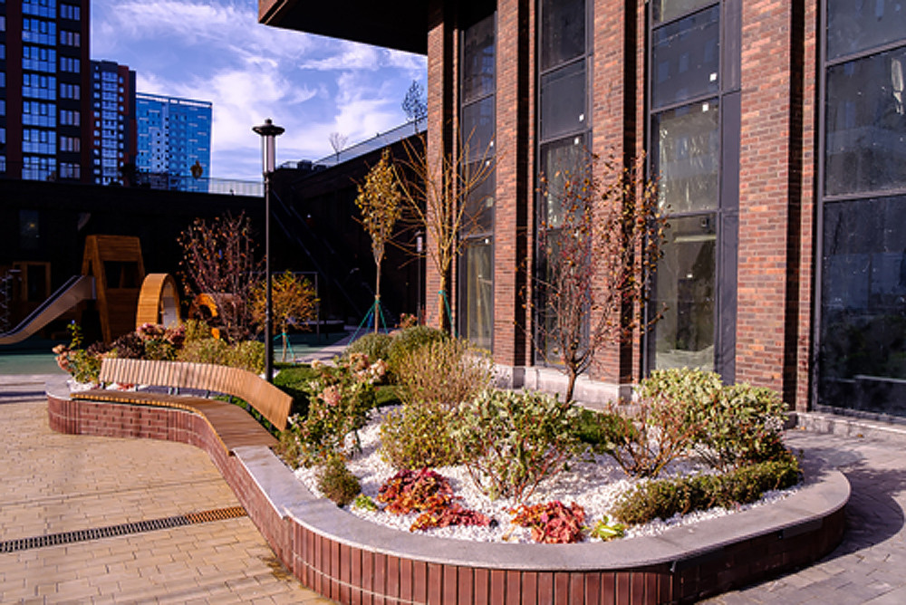 - Закрытая дворовая территория разделена на уровни для активного и спокойного отдыха