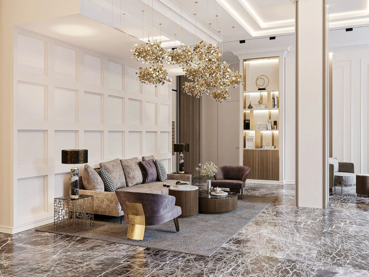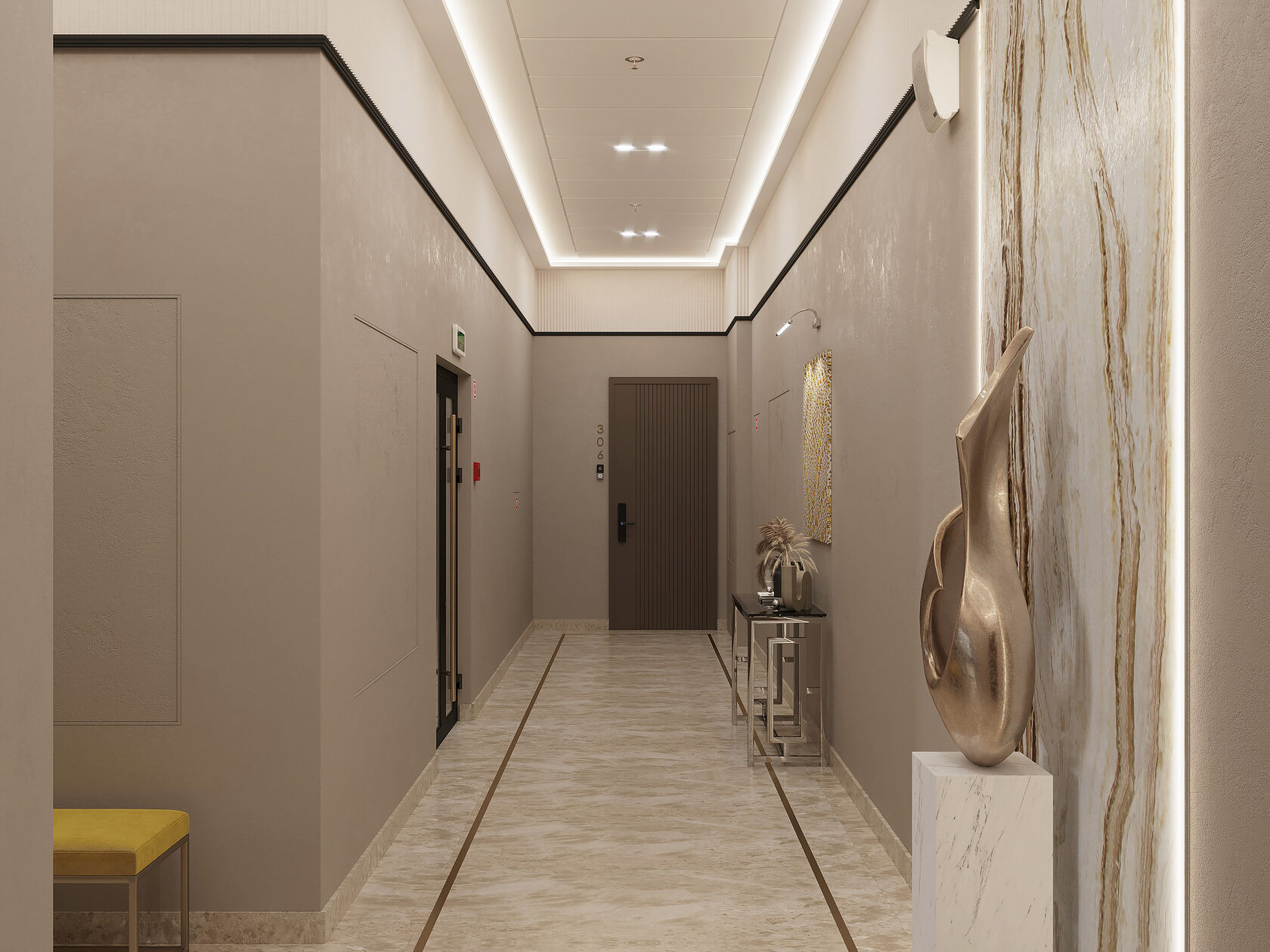 - На этаже холл с дизайнерской отделкой, мебелью и предметами интерьера
