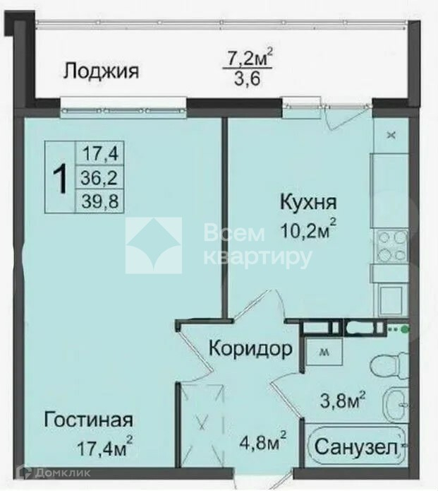 Общая площадь 39.8 м2