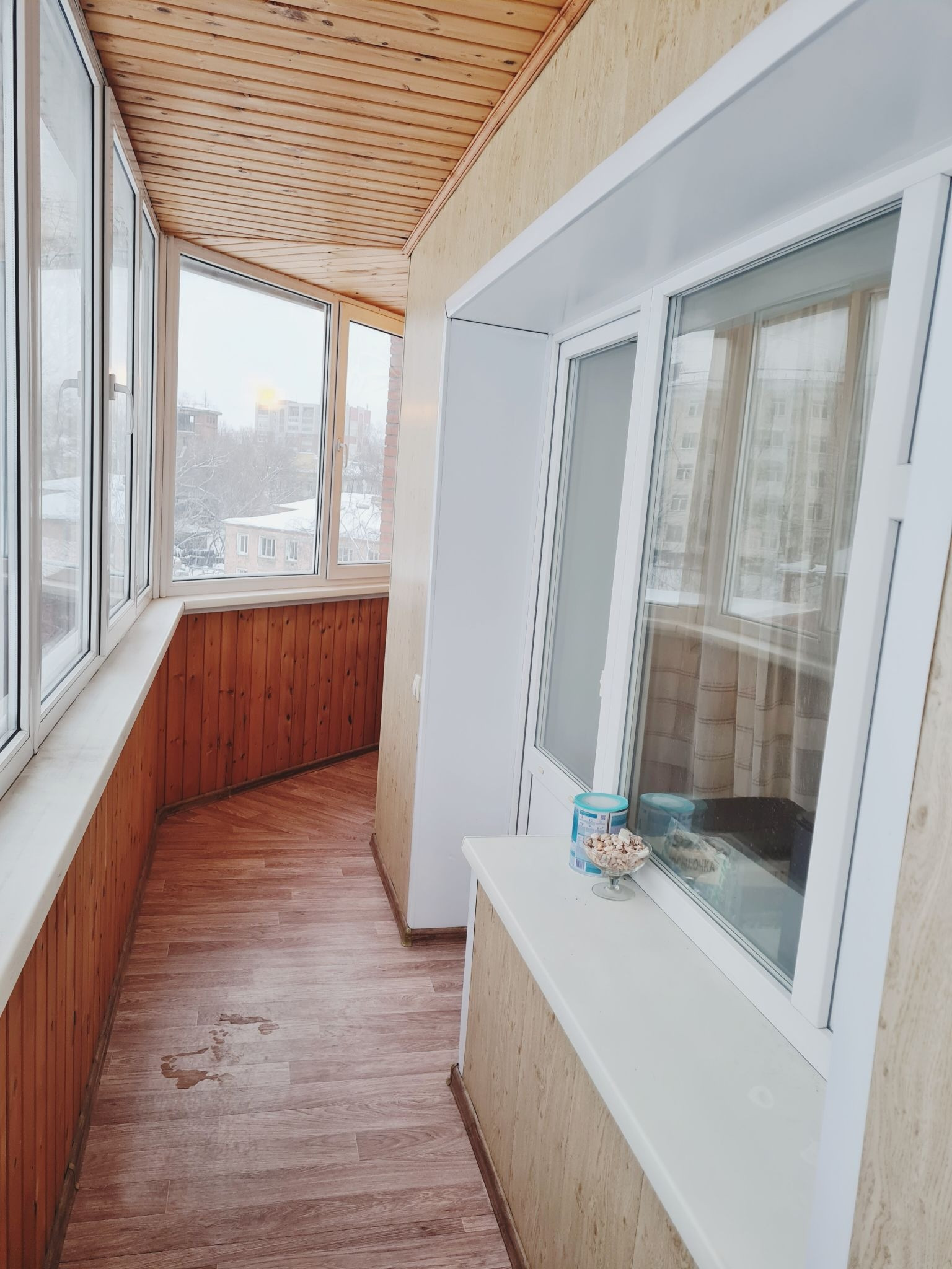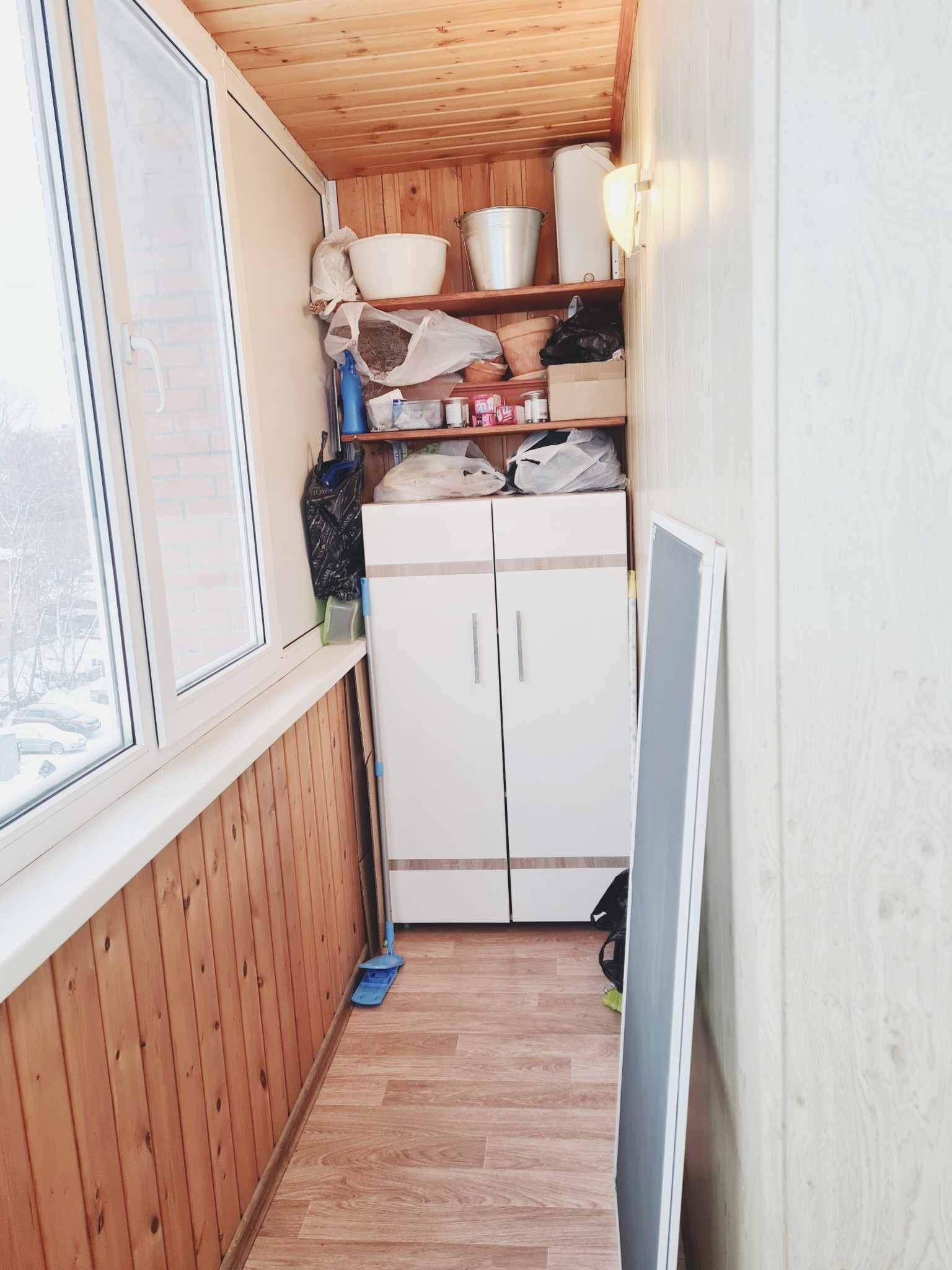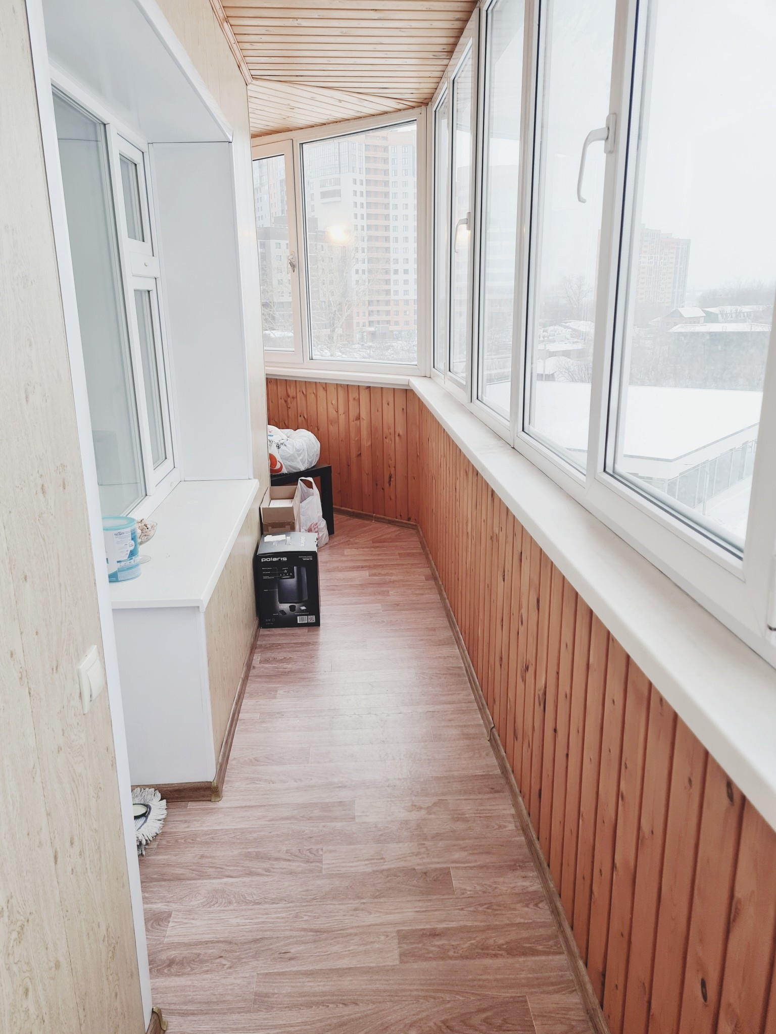 Изюминка квартиры огромная лоджия, которая полностью остеклена и общита деревом.