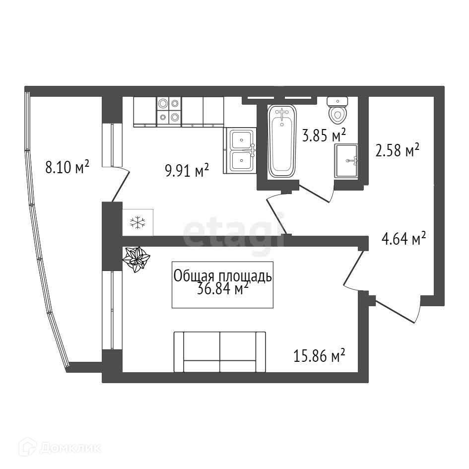 Общая площадь 36.5 м2