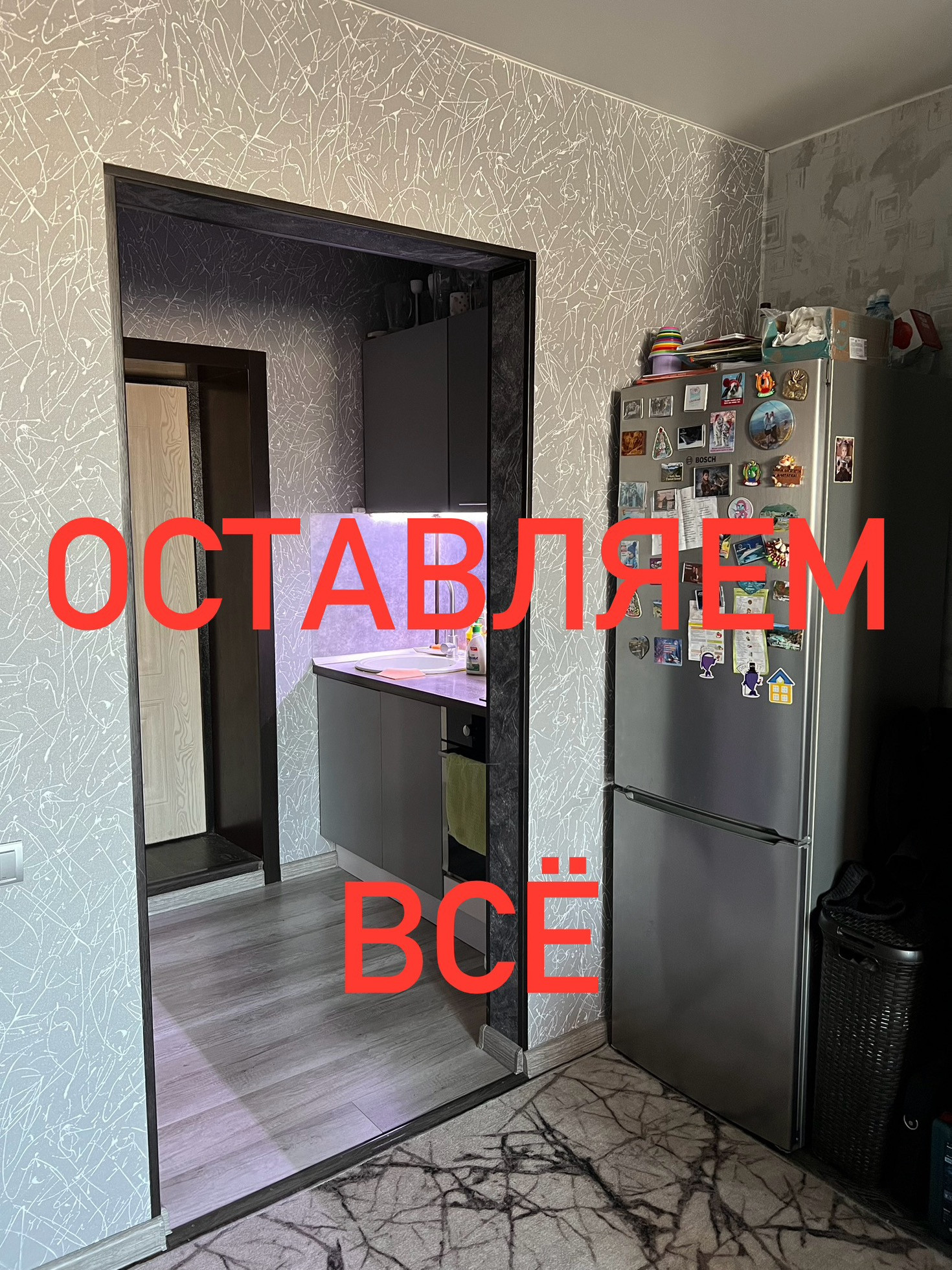 ОСТАЁТСЯ ВСЁ: гарнитур, плитка, духовка, холодильник, стиральная машина, диван, шкафы, стол, микроволновка. На лоджии кресло и комод.