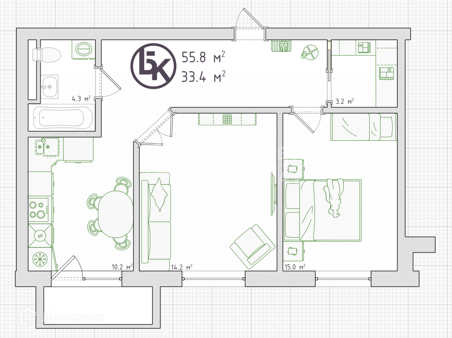 Общая площадь 55.8 м2