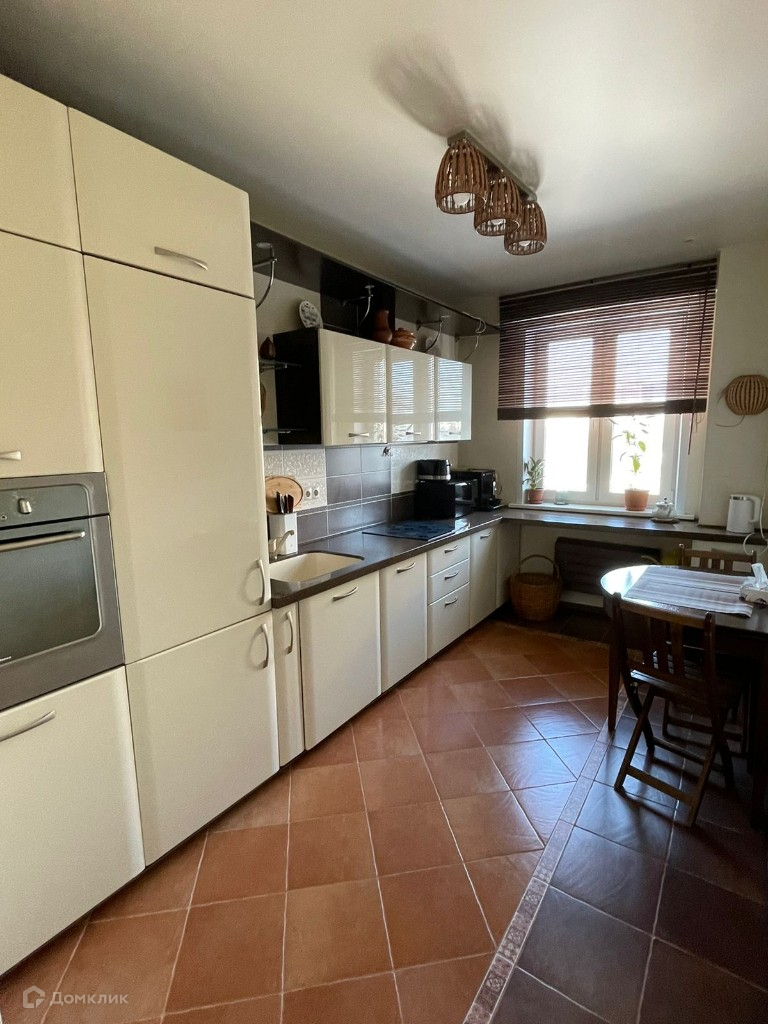Кухонный гарнитур и бытовая встроенная техника (холодильник, вытяжка, варочная панель, духовой шкаф), обеденный стол.