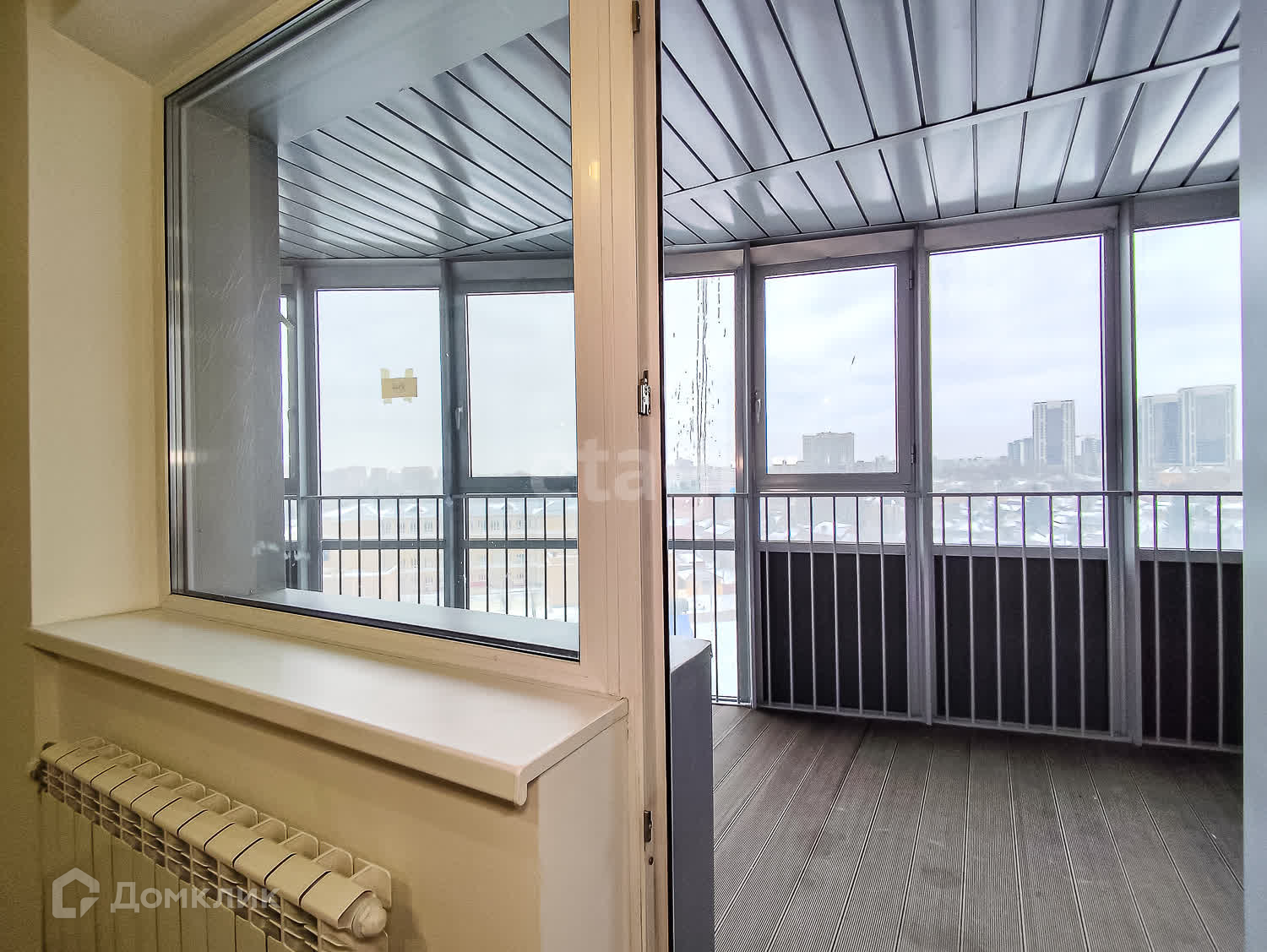 На застекленной лоджии выведен свет, на полу уложена террасная доска.