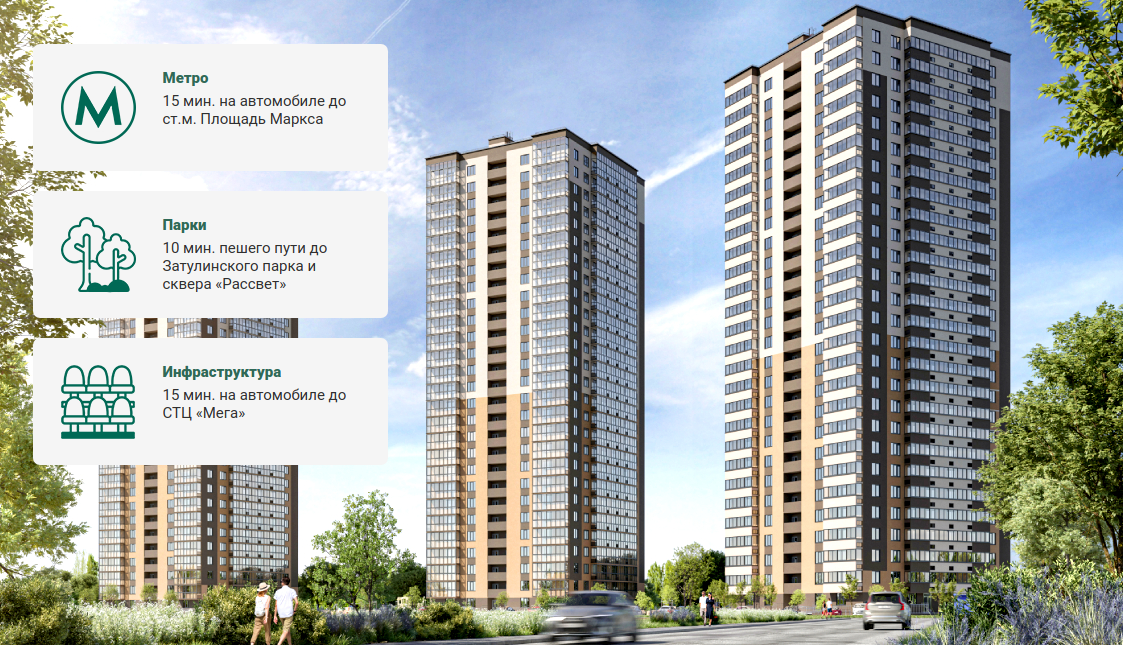 В 20 минутах на транспорте ст. м ''Площадь Маркса''. В пешей доступности: 3 школы, 4 детских сада, спортивный комплекс с бассейном, 7 супермаркетов, 2 сквера и обновленный Затулинский парк.