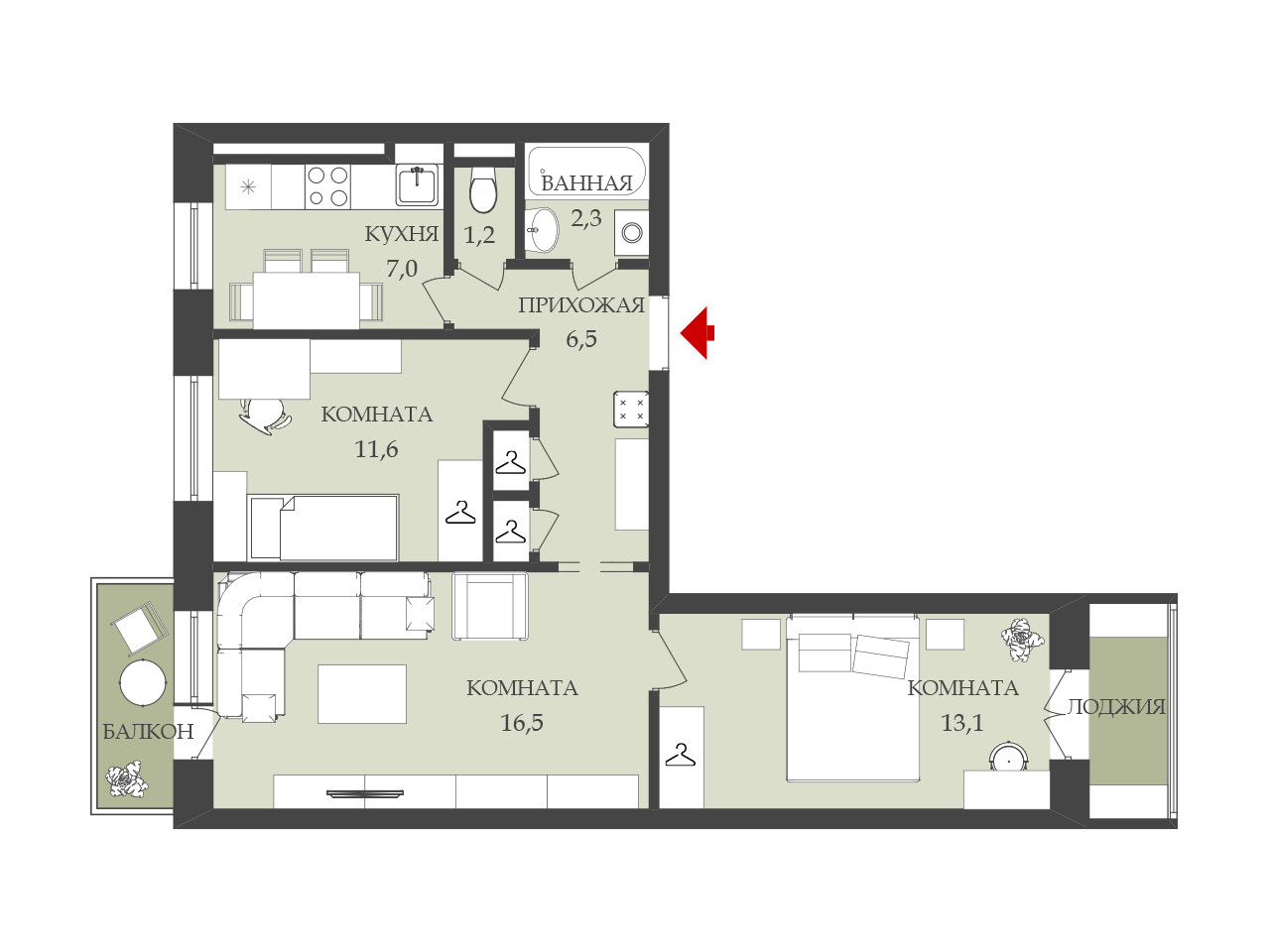 Жилая площадь 41.2 м2