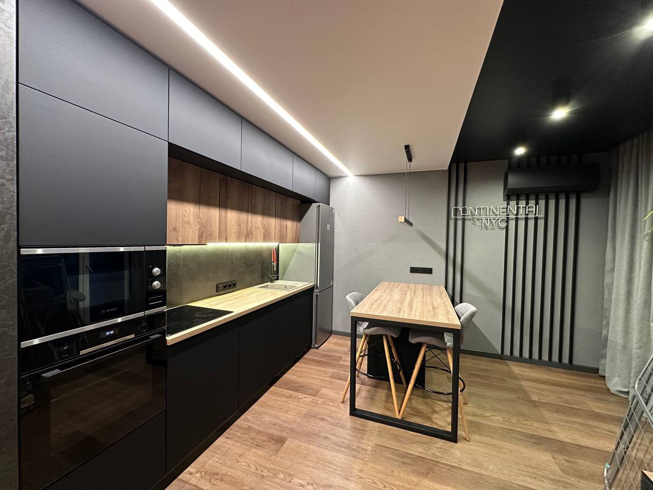 Вся кухонная техника Bosch: посудомоечная машина, варочная панель, духовой шкаф, микроволновая печь, холодильник, стиральная машина.