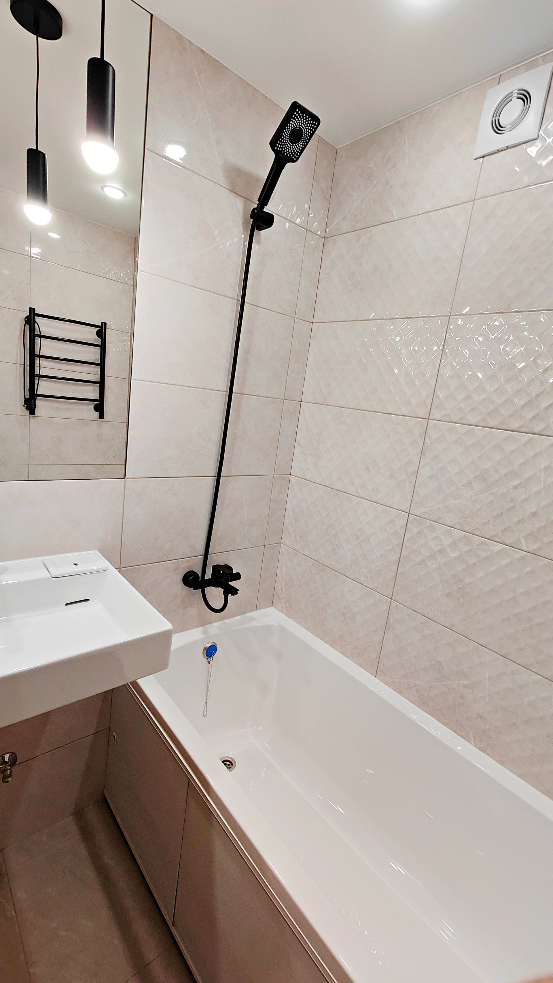 В ванной установлена специальная раковина на стиральную машину 61см, все выводы имеются. Электрический полотенцесушитель. Есть свободный угол под шкаф 40*70см.