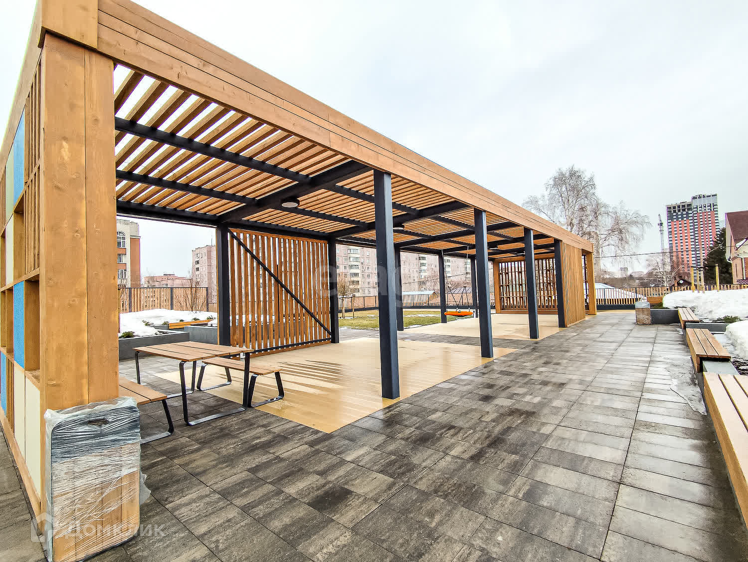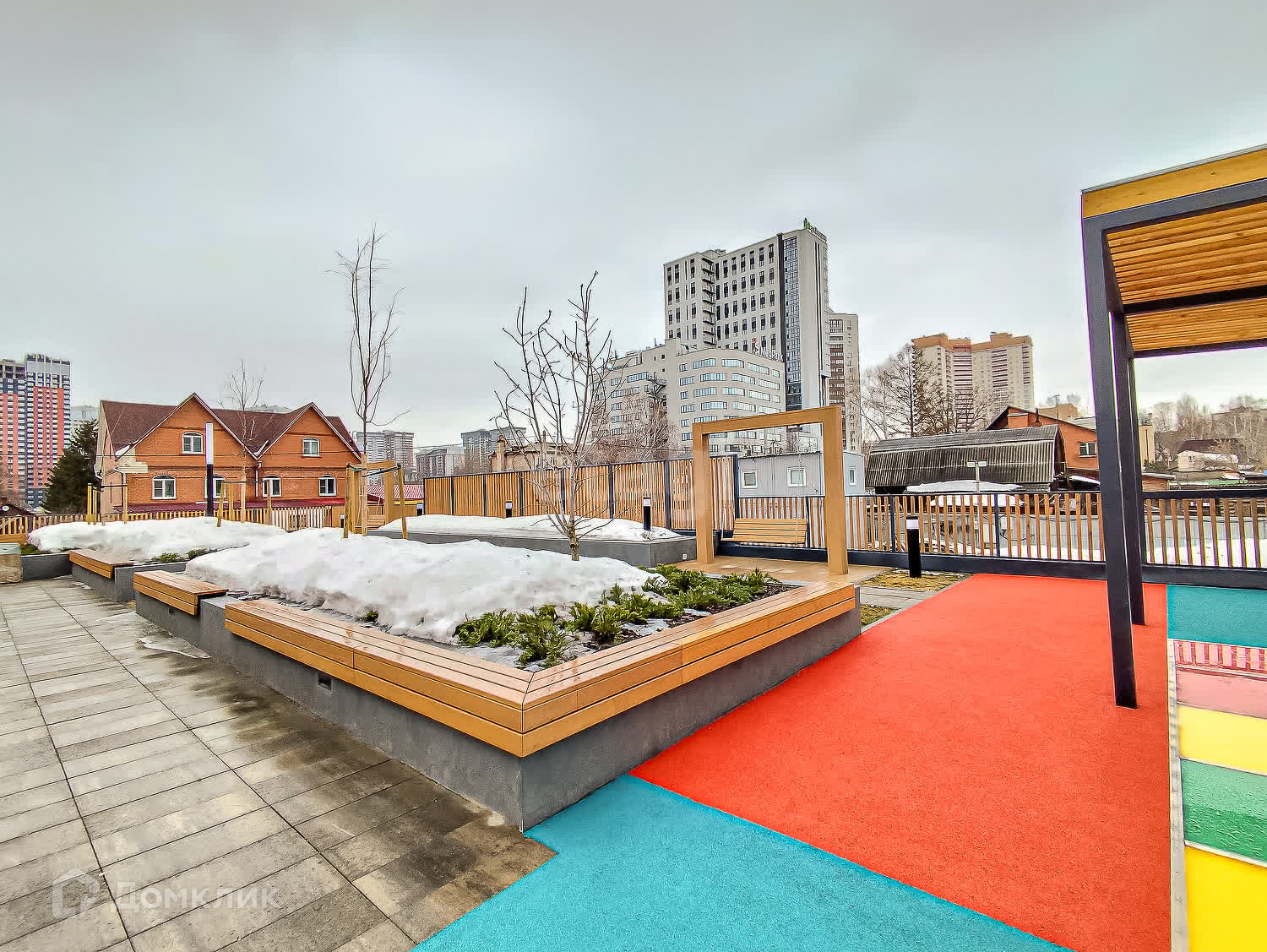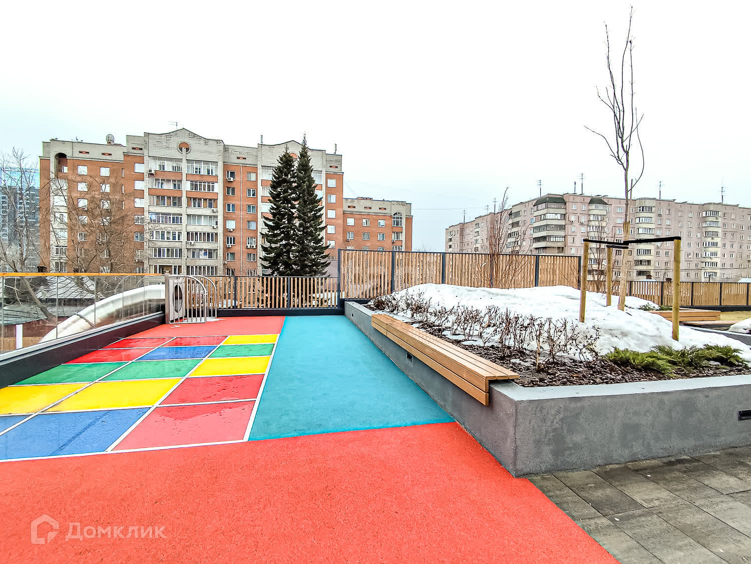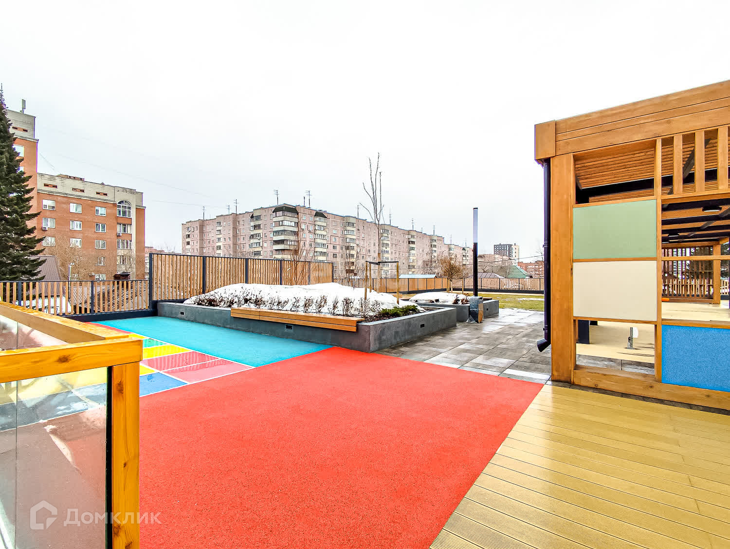 Двор-парк разделён на зоны для активного и спокойного отдыха с зелёными уголками для любителей тишины. Для безопасности жителей двор поднят над уровнем земли, на уровень второго этажа на стилобате. Периметр дома огорожен и охраняется в режиме 24/7. Во дворе нет сквозных проездов для машин, магазинов и офисов, а значит, и посторонних людей.