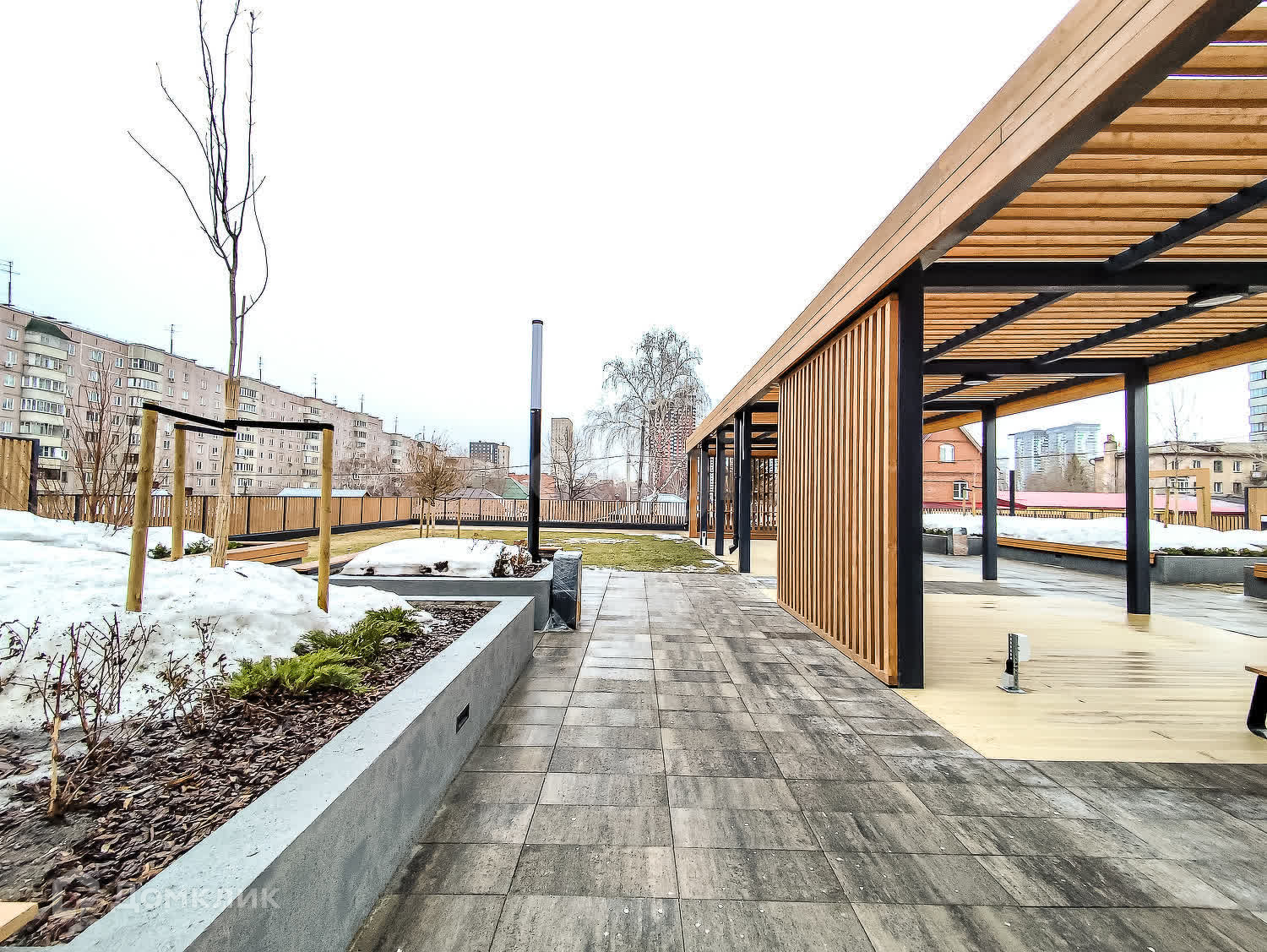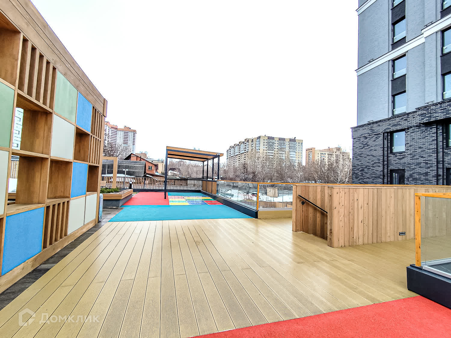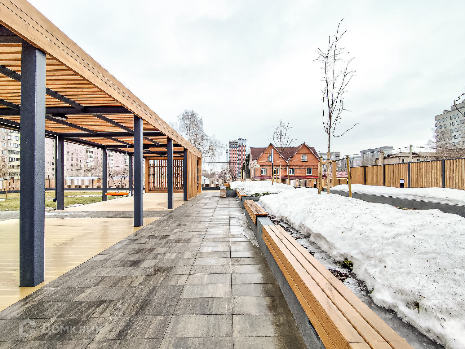 Двор-парк разделён на зоны для активного и спокойного отдыха с зелёными уголками для любителей тишины. Для безопасности жителей двор поднят над уровнем земли, на уровень второго этажа на стилобате. Периметр дома огорожен и охраняется в режиме 24/7. Во дворе нет сквозных проездов для машин, магазинов и офисов, а значит, и посторонних людей.