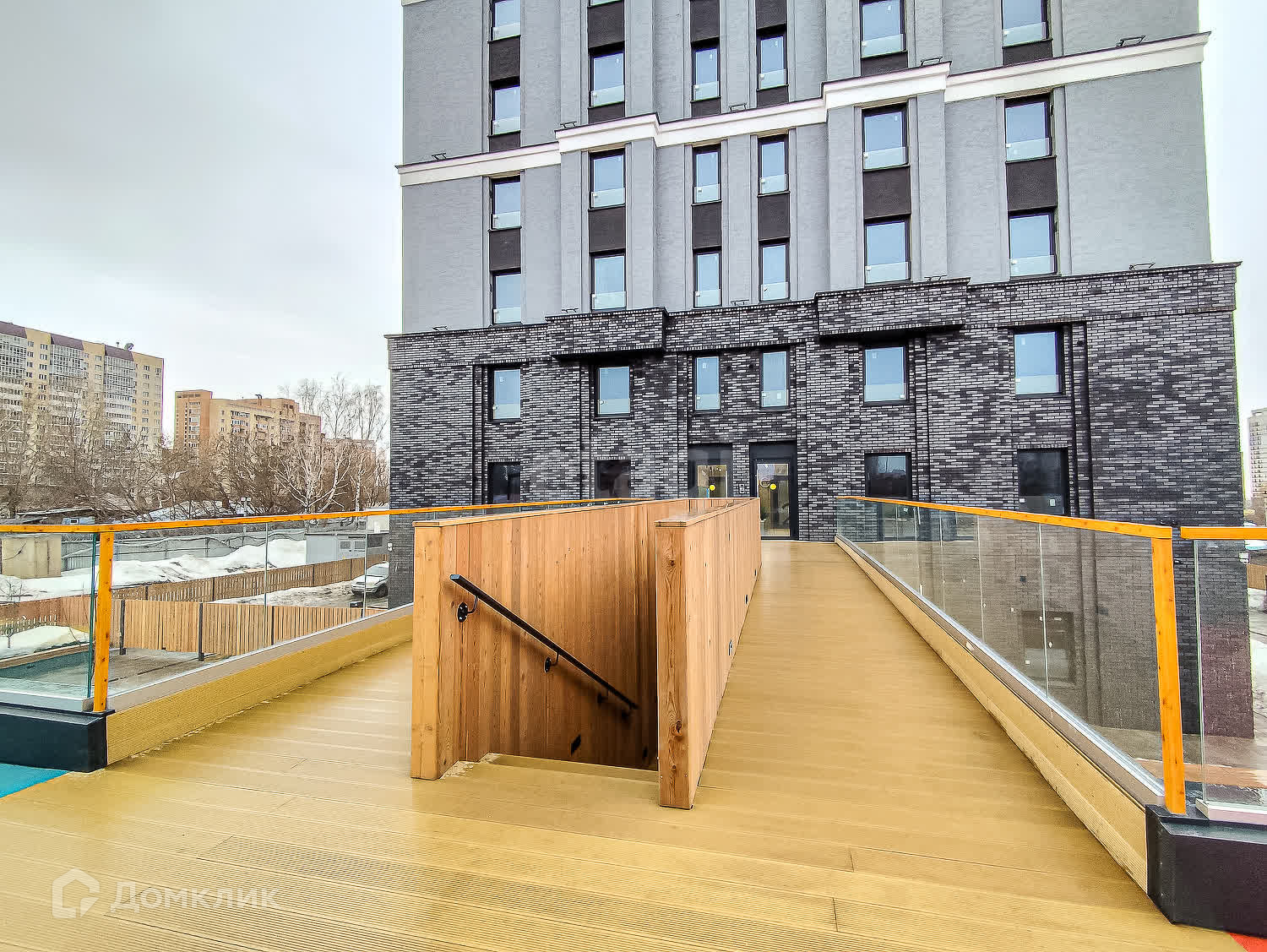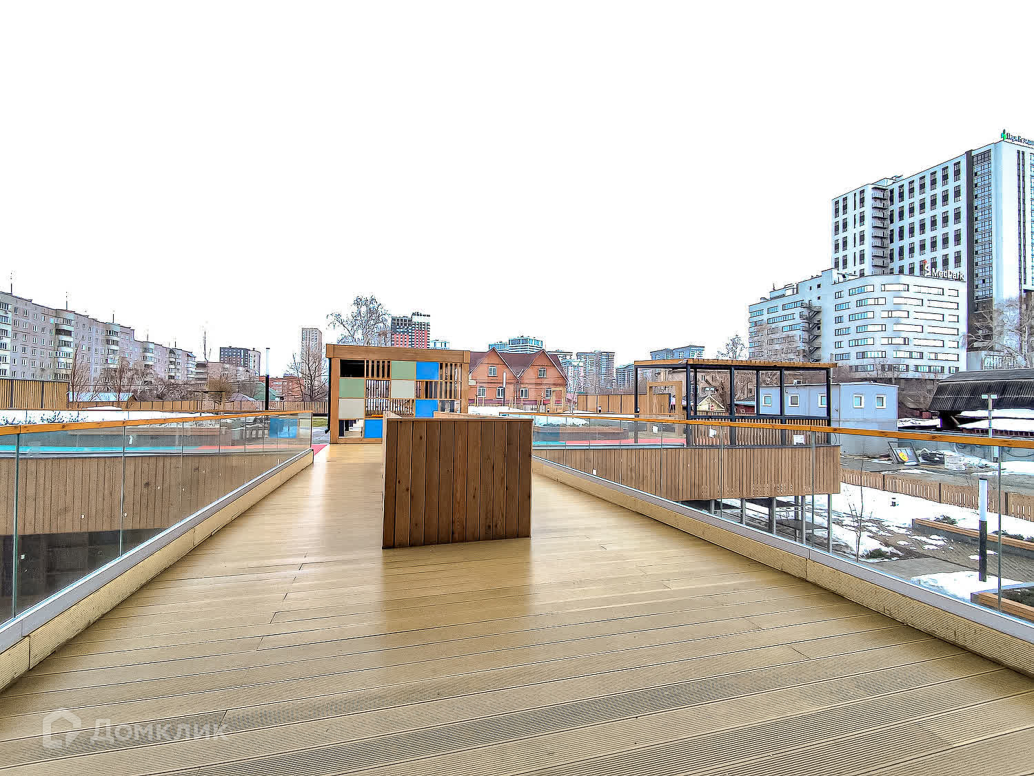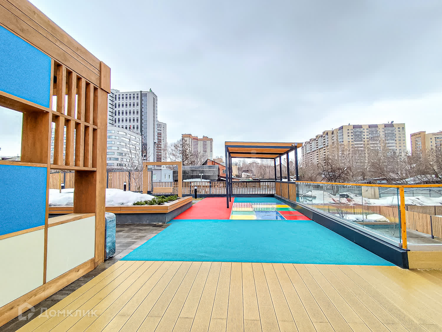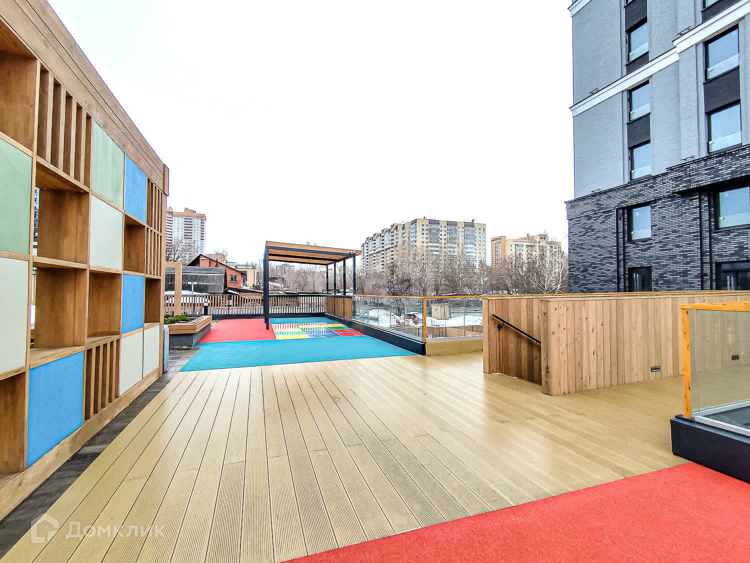 Двор-парк разделён на зоны для активного и спокойного отдыха с зелёными уголками для любителей тишины. Для безопасности жителей двор поднят над уровнем земли, на уровень второго этажа на стилобате. Периметр дома огорожен и охраняется в режиме 24/7. Во дворе нет сквозных проездов для машин, магазинов и офисов, а значит, и посторонних людей.