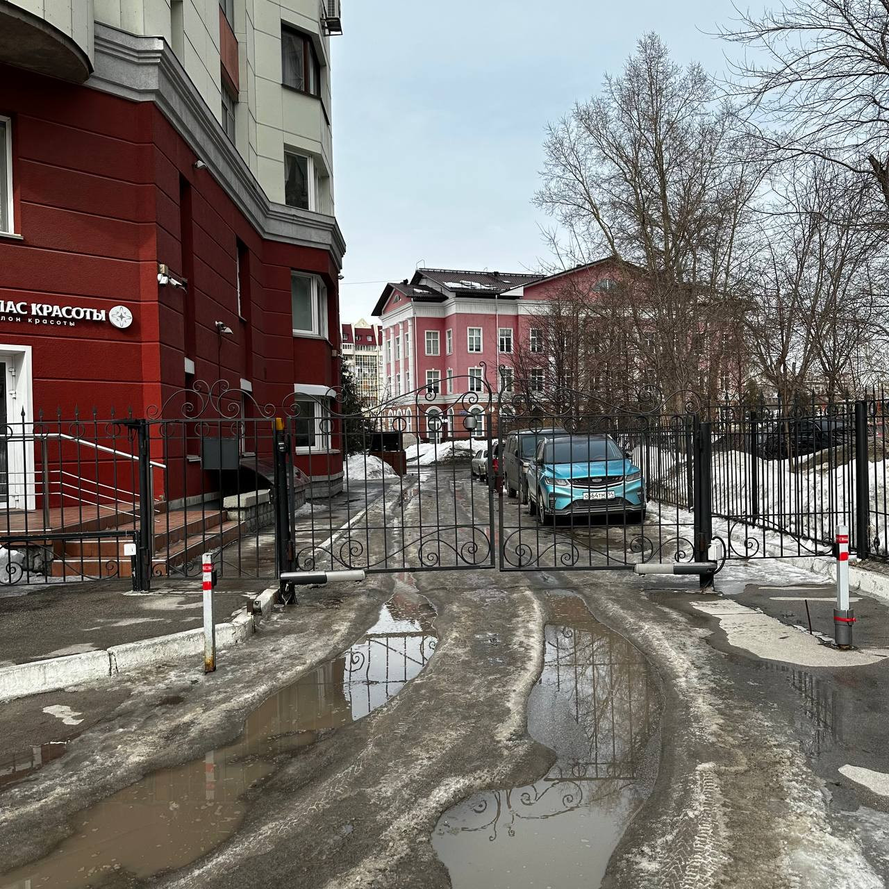 Тихий двор, закрытая территория с детской площадкой, зелеными насаждениями и свободными парковочными местами.